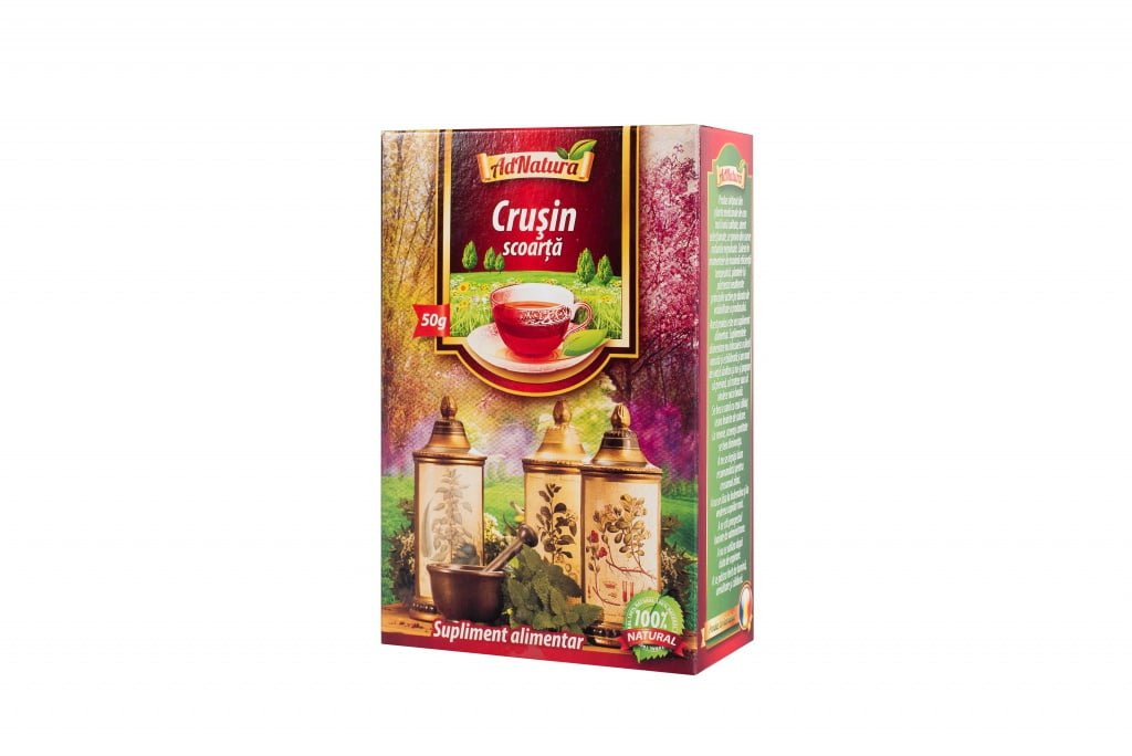 Ceaiul de crușin: Susține și reglează tranzitul intestinal. Ajută la eliminarea gazului din sistemul Menține sănătatea intestinală datorită antrachinonei, a taninurilor și a uleiului volatil, prezente în această plantă. Contribuie la apărarea organismului împotriva agenților externi. Susține starea de sănătate a intestinelor. Prezintă activități antiseptice și antiinflamatoare la nivel cutanat. MOD DE UTILIZARE: Intern: 1-2 linguriţe de produs se umectează cu apă, se lasă în repaos 10 minute, se adaugă apoi 200 ml apă clocotita, se fierbe apoi 10 minute la foc mic. Se lasa acoperit 10-15 minute, dupa care se filtrează. Se bea o cană cu ceai călduţ seara înainte de culcare; la nevoie, aceeaşi cantitate se bea dimineaţa. Atentionari : La dozele şi la modul de utilizare recomandate nu se cunosc efecte adverse, excepţie putând face unele persoane alergice la oricare dintre ingrediente.