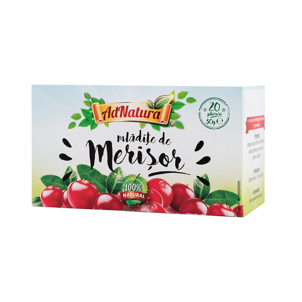 Ceai de merișor mlădițe, 25 plicuri, Adnatura [6422875020053] Proprietăți: Antiseptic urinar, antiinfecțios, antiinflamator, diuretic, dezinfectant renal, expectorant, antitusiv, antioxidant. Mod de administrare: Se beau 2-3 căni cu ceai pe zi. Conține: Conține mlădite de merișor - Vaccinium vitis idaea. Uz intern - infuzie. Prezentare: 25 plicuri