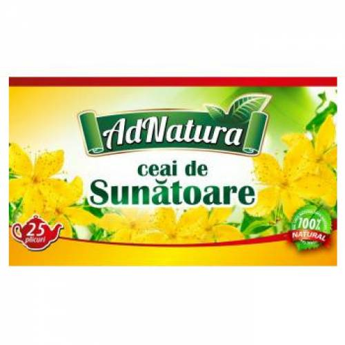 Ceai de sunătoare, AdNatura, 20 plicuri Ingrediente: Părţile aeriene, înflorite ale plantei de sunătoare (Hypericum perforatum) Principii active: Ulei volatil, derivaţi polifenolici (hiperazida), rutozid, cvercetol, acid ascorbic, acid cafeic şi clorogenic, săruri minerale, tanin de natură catehică până la 12%, hipericină, etc. Ceaiul de sunătoare: Susține sănătatea hepatică, contribuie la regenerarea celulelor ficatului. Poate proteja celulele și țesuturile împotriva daunelor oxidative. Atenuează tulburările de somn prin hipericina (o napthodianthronă) din compoziție. Susține sănătatea tractului urinar inferior si sănătatea respiratorie. Susține starea psihologică echilibrată și sănătatea mintală. Benefic pentru sănătatea cutanată. Mod de utilizare: Intern: infuzie din 1 plic de produs la o cană de apă clocotită, se acoperă şi se lasă 10-15 minute, se îndulceşte după gust, se beau câte 2-3 ceaiuri pe zi.. Extern: se prepară ca infuzie concentrată: se introduc 2 plicuri plantă în 100 ml apă clocotită, se acoperă şi se lasă 10-15 minute. Se aplică pe piele sub formă de comprese sau cataplasme – are proprietatea de a calma durerile; cicatrizează rănile, îndeosebi în cazul arsurilor. Contraindicaţii La persoanele sensibile poate provoca, în timpul tratamentului, fotodermatoze. A se evita consumul ceaiului de sunătoare atunci când pacientul este sub tratament medicamentos (contraceptive, antibiotice, etc.).