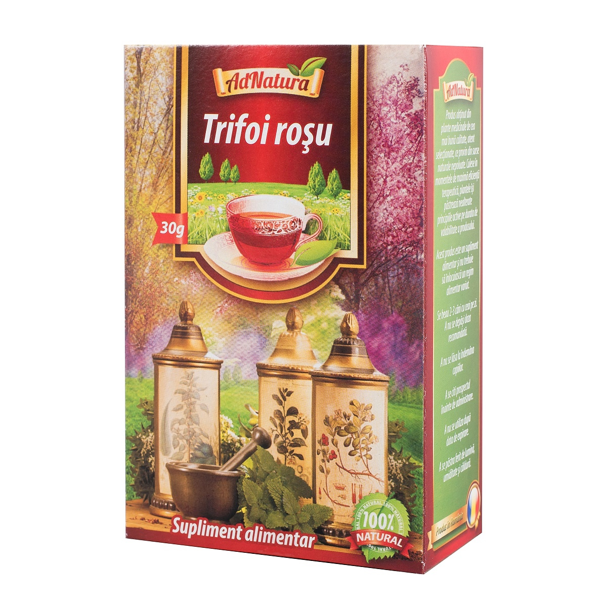 Ceai de Trifoi roșu, 30 g, AdNatura [6422875000130] Proprietăți: Planta are proprietăți depurative, antitusive, expectorante, antiinflamatoare, antispastice, diuretice, emoliente, estrogenice, cicatrizante și antitumorale. Recomandări: Intern: antispastic, antiinfecțios, antiinflamator, entero-colite, infecții urinare, inflamații ale căilor urinare, reumatism, dismenoree, leucoree, artroze, spondilită, gută, bronșite, tuse spastică, tuse convulsivă, astm bronșic. Extern: boli de piele - acnee, eczeme, ulcerații, psoriazis sau alte dermatoze cronice. Compoziție: Flori de trifoi roșu - Trifolium pratense. Principii active: Saponozide triterpenice și flavonozide (izoflavone cu acțiune de tip estrogenic), acizi fenolici, ulei volatil, cumarine. Mod de administrare: Intern: infuzie din 1 linguriță de produs la o cană de apă clocotită, se acoperă și se lasă 10-15 minute, se beau câte 2-3 ceaiuri pe zi. Pentru a beneficia de întreg potențialul curativ al plantei, se recomandă utilizarea sa sub formă de extract la rece: peste două lingurițe de plantă se toarnă 250 ml apă rece. Se amestecă bine și după 20 de minute se strecoară lichidul într-un vas. Extern: se prepară ca infuzie concentrată - se introduc 2 lingurițe plantă în 100 ml apă clocotită, se acoperă și se lasă 10-15 minute. Se aplică pe piele sub formă de comprese sau cataplasme. Contraindicații: Nu are. Prezentare: 30 g
