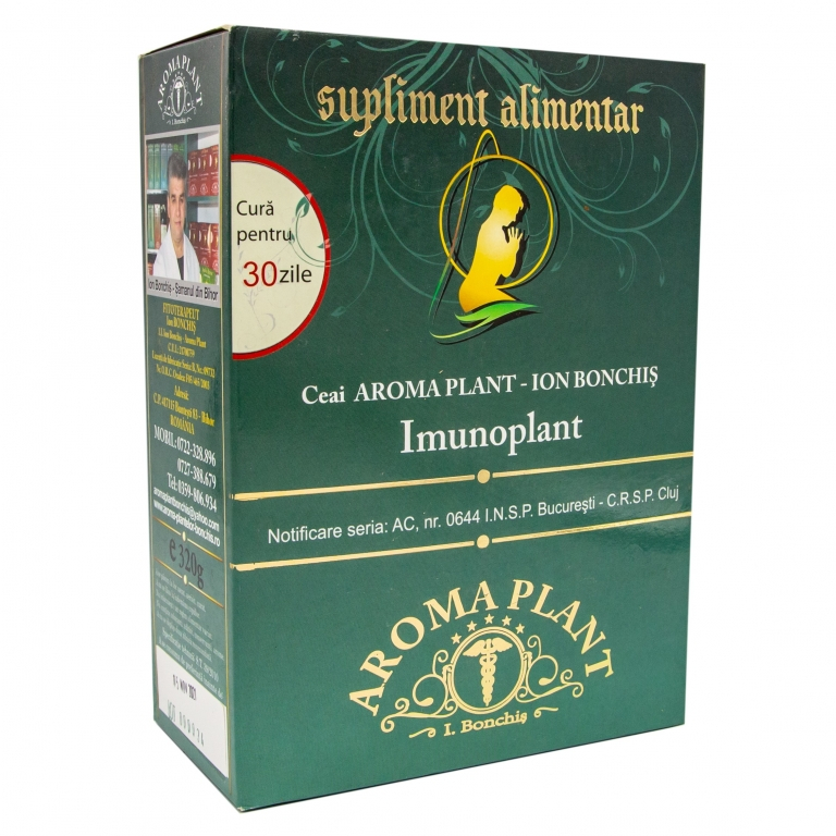 Ceai Imunoplant 160 g Aroma Plant Bonchis Ceai Imunoplant are in combinatie un amestec de 32 plante medicinale care ajuta la revigorarea organismului, sporeste rezistenta la stres si boli, stimuleaza aparatul digestiv. Compozitie: Feriguta de stanca, Caldaruse, PAstite, Coacaze de munte, Drobita, Pupezele/Lintea cucului, Fratele priboiului, Crestata, Iarba vulturului, Napraznic, Mierea ursului, cuscrisor, Luminarica pamantului, Vasc, Anghinare, Echinaceea, Cornisor, Scarita muntelui, Opaita rosie, Floarea pastilor, Zmeura, Borceag, Mazarichea cucului, Macrisul iepurelui, Iarba inpuscata/ruen negru, Clopotul caprei, PAraluta de munte, Roinita, Maseaua ciutei, Gentiana, Salvia, Urzica, Cimbrisor Recomandari: Rol terapeutic: Se utilizeaza cu rezultate uimitoare in revigorarea organismului. Sporeste rezistenta la stres si boli. Stimuleaza aparatul digestiv, circulator, functiile renale, cardiovasculare, hepato-biliare. Stimuleaza organismul in producerea de anticorpi si inmultirea leucocitelor. Regleaza tensiunea si dereglarile hormonale. Administrare Mod de administrare: Se bea 3 cani cu ceai/zi, inaintea meselor principale. Durata tratamentului este de 30-60 de zile/an. Pe perioada curei, ceaiul poate inlocui apa. A se respecta doza recomandata. Mod de preparare: Se prepara o infuzie dintr-o lingurita cu plante la 250 ml apa, cand apa da in clocot, se pun plantele, se opreste din fiert, se acopera si se lasa la racit 15-20 minute.