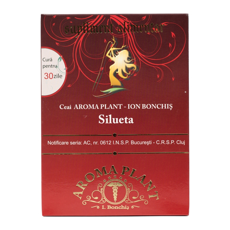 Ceai Silueta Aroma Plant Bonchis Tratament pentru obezitate. Ceai Silueta are in combinatie un amestec plante medicinale care ajuta la arderile catabolice, combate anabolismul, reduce pofta de mancare, dizolva grasimile, elimina celulita, elimina surplusul de apa. Compozitie: amestec de 16 plante medicinale 100% naturale. soc, papadie, mesteacan, sangele voinicului, matase de porumb, cicoare, coada calului, cretisoara, crusin, afin, limba cerbului, turita de mare, coada soricelului, tintaura, pelin, urzica. Recomandari: Acest produs este recomandat tuturor persoanelor care sunt interesate de mentinerea sau imbunatatirea siluetei personale. Are efect diuretic, laxativ, arzator de grasimi, elimina retentia de apa din organism. Pentru o cura si mai eficienta, folositi in combinatie cu tinctura pentru silueta. Doze și mod de administrare: Ceaiul Silueta se prepara prin infuzare. Se pune 1 litru de apa la fiert, cand incepe sa fiarba apa se adauga 2 linguri de amestec de plante. Se amesteca si se ia de pe foc. Se acopera pentru 20 de minute. Pe parcursul zilei trebuie sa bei 5 cani din acest ceai. Cate o cana inainte de mesele principale si apoi intre mese.