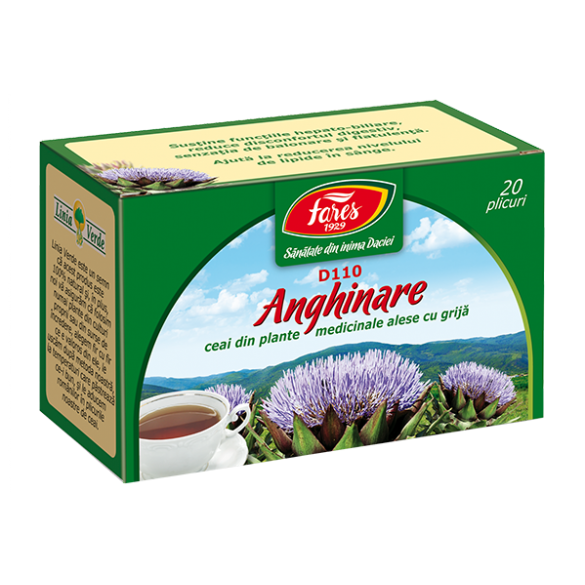 Susţine funcţiile hepato-biliare, reduce disconfortul digestiv, senzaţia de balonare şi flatulenţa. Ajută la reducerea nivelului de lipide în sânge. Contribuie la menţinerea sănătăţii ficatului. BENEFICII - susţine secreţia şi eliminarea bilei în intestin. - ajută la optimizarea tranzitului intestinal în cazul unei eliminări lente a bilei. - hepatoprotector. - susţine digestia şi metabolizarea grăsimilor, contribuind la reducerea nivelelor de colesterol şi trigliceride. - contribuie la evitarea acumulării de grăsimi la nivelul ficatului. - ajută procesul digestiei stimulând secreţia sucurilor gastro-intestinale, contribuind astfel la reducerea disconfortului abdominal, balonării şi la eliminarea gazelor intestinale. - utilă pentru menţinerea supleţii pereţilor vaselor de sânge. - susţine pofta de mâncare. - susţine procesul de excreţie la nivel renal şi eliminarea reziduurilor metabolice din organism, contribuind astfel şi la calmarea reacţiilor iritative ale pielii. COMPOZITIE Anghinare Frunzele plantei Cynara scolymus L., fam. Asteraceae, care conţin cinarină, polifenoli, acid clorogenic, flavone, substanţe amare, săruri de potasiu şi magneziu, tanin. MOD DE ADMINISTRARE Se beau 2-3 căni cu ceai pe zi. A nu se administra continuu o perioadă mai lungă de 3 luni. Dacă aveţi nevoie în continuare de acest ceai, puteţi relua administrarea după o pauză de o lună. PREPARARE: Peste un plic se toarnă 200 ml apă clocotită şi se lasă 10-15 minute acoperit. ATENŢIONĂRI: Nu se administrează în obstrucţie biliară, insuficienţă hepatică gravă, sarcină, alăptare şi în caz de hipersensibilitate la această plantă. A se pastra la loc uscat si la temperatura mediului ambient