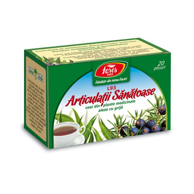 Ceai Articulatii sanatoase - 20 pl Fares Contribuie la eliminarea disconfortului articular. Menţine mobilitatea şi flexibilitatea articulaţiilor. Sfaturi practice de dietă şi stil de viaţă: În cazul unei mobilităţii articulare reduse asociate cu disconfort, vă recomandăm să reduceţi cât mai mult posibil din alimentaţie consumul de carne, pâine albă, produse de patiserie, zahăr alb. Este bine să consumaţi fructe şi în special citrice, oleaginoase (nuci, ulei de măsline, ulei de cânepă), legume (varză, sucul de cartof crud, hreanul), grâu încolţit. Faceţi băi fierbinţi, saună şi masaj uscat. Pentru evitarea acumulării acidului uric în organism, regimul alimentar constă în reducerea cantităţii de alimente uricogene, în primul rând proteine animale (carnea, peştele gras, brânzeturile, ouăle) şi a unor legume (fasolea uscată, lintea), oleaginoase, ciocolată, cacao, sare, alcool. Recomandăm consumul de alimente care duc la alcalinizarea urinei (fructe, legume, lactate slabe, pâine şi cereale, ceaiuri medicinale diuretice). În cantitate moderată (o porţie pe zi) se pot consuma ciuperci, conopidă, mazăre verde, spanac, cereale integrale, soia. Consumaţi zilnic cel puţin 2 litri de apă pentru a stimula eliminarea deşeurilor metabolice şi a toxinelor (de preferinţă apă alcalină). Ingrediente: Scoarţă de salcie (Salicis cortex) 15%, muguri de plop (Populi gemma), frunze de mesteacăn (Betulae folium), flori de soc (Sambuci flos), fructe de ienupăr (Juniperi fructus) 10%, frunze de frasin (Fraxini folium), urzică vie (Urticae herba), flori de lavandă (Lavandulae flos), frunze de rozmarin (Rosmarini folium). Beneficii: - Susţine sănătatea articulaţiilor. – Ajută la reducerea disconfortului articular. – Contribuie la întreţinerea mobilităţii, flexibilităţii şi a supleţii articulare. – Contribuie la eliminarea acidului uric prin excreţie la nivel renal, şi la reducerea disconfortului cauzat de acumularea uraţilor la nivelul articulaţiilor. Mod de adimistrare: Se beau 3 – 4 căni cu ceai pe zi, între mese. Preparare: Peste un plic se toarnă 200 ml apă clocotită şi se lasă 10-15 minute acoperit. Durata unei cure este de 6 – 8 săptămâni Cura se poate repeta după o pauză de o lună. Atenţionări: Acest ceai se foloseşte cu prudenţă la copii sub 12 ani. Nu se administrează în caz de hipersensibilitate la oricare dintre ingredientele produsului. Sarcină şi alăptare: A se folosi cu prudenta de catre femeile însărcinate şi mamele care alăptează. Efecte secundare şi interacţiuni: La dozele recomandate nu au fost semnalate incompatibilităţi cu medicamentele şi nici efecte secundare.
