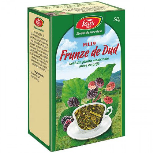 Ceai Dud - Frunze - 50 gr Fares Contribuie la menţinerea unui nivel normal de glucide în sânge Întrebuinţări principale: adjuvant în tratamentul diabetului zaharat, diaree. Alte întrebuinţari: ulcer gastric şi duodenal, răceli. Ingrediente: Frunzele de Morus alba L. Conţin taninuri, steroli, flavonoide, acizi organici, beta-caroten, substanţe minerale. Beneficii: Hipoglicemiant, astringent, sudorific, depurativ, antibacterian. Mod de administrare: Se beau 2-3 căni cu ceai pe zi. Preparare: se prepară infuzie din 1 linguriţă plantă la o cană cu apă. Contraindicaţii: la dozele recomandate nu se cunosc.