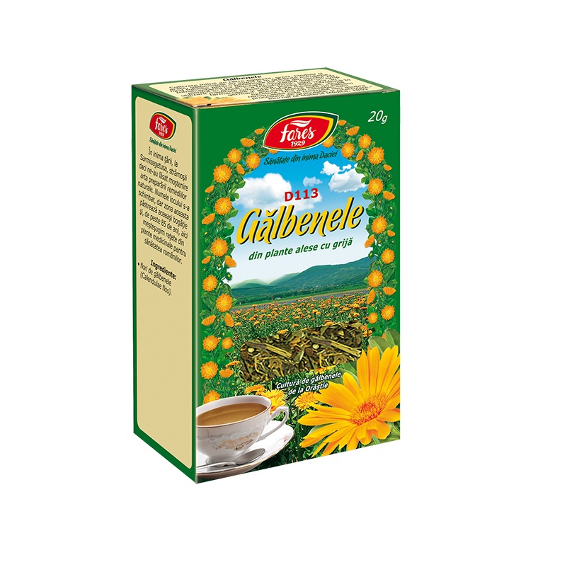Ceai Flori de Gălbenele, D113, 20 g, Fares [5941141000939] Proprietăți: Contribuie la funcționarea normală a aparatului digestiv. Ajută la menținerea sănătății ficatului. Sprijină refacerea țesutului cutanat. Fiind printre cele mai cunoscute și folosite plante din medicina populară românească, gălbenelele și-au câștigat faima prin acțiunea sa benefică în îngrijirea pielii, și în îmbunătățirea funcționarii ficatului și stomacului. Ingrediente: Florile plantei Calendula officinalis L., fam. Asteraceae, care conțin carotenoide, flavone, saponine, mucilagii, triterpene, rezine, ulei volatil, substanțe amare, vitamina C. Efect: Antiinflamator, antimicrobian, cicatrizant, antipruriginos, antispastic, coleretic-colagog (stimulează secreția și eliminare abilei), emenagog (favorizează declanșarea ciclului menstrual), antitrichomonazic. Întrebuințări principale: Gastrița, ulcer gastroduodenal. Alte întrebuințări: Colecistită, colită, dismenoree, amenoree, inflamații ale gurii și faringelui, iritații și inflamații ale pielii, hemoroizi, vulvovaginite, tricomoniază. Contraindicații: Sarcina. Preparare: Uz intern: se prepară infuzie din 1-2 lingurițe flori la o cană cu apă. Uz extern: se prepară o infuzie din 2 linguri de flori la 250 ml apă. Mod de administrare: Uz intern: se beau 2-3 căni cu ceai pe zi, între mese. Uz extern: se face gargară, băi locale, spălături vaginale sau se aplică comprese pe zonele afectate. Prezentare: 20 g