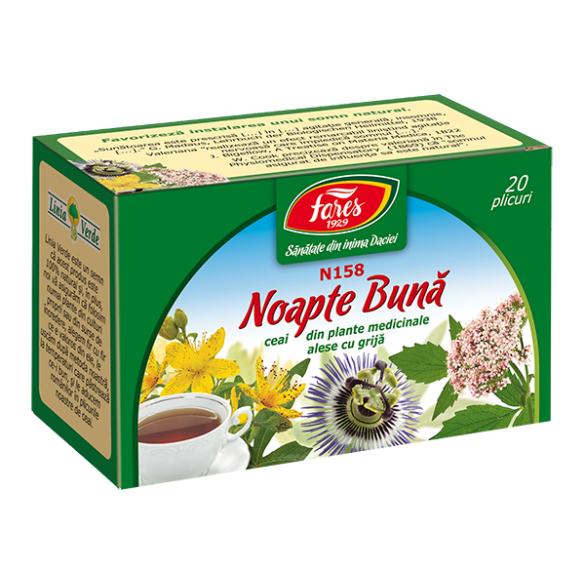 Ceai Noapte Buna, N158, 20 plicuri, Fares [5941141013328] Ceai Noapte Buna, N158 Proprietati: - acest ceai are actiune sedativa, relaxanta si calmanta prin compozitia complexa a plantelor din formula sa; - sunatoarea contine ulei volatil cu efect calmant si hipericina cu efect antidepresiv, ea asigura o buna calitate a somnului mentionand un tonus ridicat peste zi; - roinita, radacina de valeriana, conurile de hamei si passiflora au actiune sedativa a sistemului nervos central, combat agitatia si induc un somn odihnitor, acestora li se adauga actiunea linistitoare si calmanta a uleiurilor volatile din tei, maghiran si lavanda; - recomandat in insomnii, nervozitate, stari depresive, distonii neuro-vegetative, migrene. Ingrediente: Sunatoare (Hyperici herba) 15%, roinita (Melissae herba), radacina de valeriana (Valerianae radix) 15%, conuri de hamei (Lupuli strobuli), sulfina (Meliloti herba), maghiran (Majoranae herba), flori de tei (Tiliae flos), passiflora (Passiflorae herba) 5%, flori de lavanda (Lavandulae flos). Mod de administrare: Se beau 1-2 cani seara, sau la nevoie. Durata unei cure este de 3-4 saptamani. Cura se poate relua dupa o pauza de o luna. Mod de preparare: Peste un plic se toarna 200 ml apa clocotita si se lasa 10 minute acoperit. Prezentare: 20 plicuri