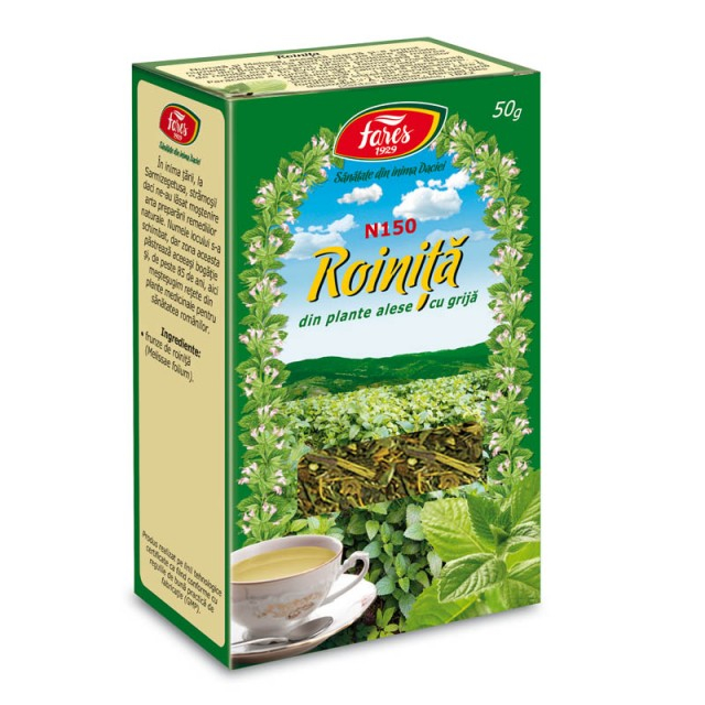 Ceai Roinita - Frunze N150 - 50 gr Fares Suport pentru relaxare şi bună dispoziţie Ajută la buna funcţionare a stomacului şi intestinelor. Numită şi Melissa, această plantă şi-a primit numele de la mierea parfumată pe care albinele o fac din florile ei: anticii greci credeau că mierea de roiniţă era nectarul, hrana privilegiată a zeilor olimpieni. În Evul Mediu, faimosul medic Paracelsus a numit roiniţa „elixirul vieţii” datorită efectului său calmant asupra inimii. „Este tonică, […] ajută digestia; […] stimulează sistemul nervos pe care îl fortifică şi […] induce starea de bună dispoziţie.” A. Gautier, Manuel des plantes medicinales, 1822. Întrebuinţări principale: Insomnie, nervozitate, anxietate, dureri de cap Alte intrebuintari: Nevroze gastrice si cardiace, indigestie, greata, reflux esofagian, dischinezie biliara, balonare, colici. Ingrediente: Frunzele plantei Melissa officinalis L., fam Lamiaceae, conţine ulei volatil, acid cafeic, acid clorogenic, acid rosmarinic, flavonoide. Beneficii: Sedativ, antispastic, antiemetic (indeparteaza senzatia de greata), carminativ (ajuta eliminarea gazelor intestinale), coleretic-colagog (stimuleaza secretia si eliminarea bilei), antiinflamator, antiulceros, antiseptic. Mod de administrare: Se beau 2 – 3 căni cu ceai pe zi. A nu se administra continuu o perioadă mai lungă de 3 luni. Dacă aveţi nevoie în continuare de acest ceai, puteţi relua administrarea după o pauză de o lună. Preparare: Peste o linguriţă plantă se toarnă 200 ml apă clocotită şi se lasă 10-15 minute acoperit, apoi se strecoară. Contraindicatii: Nu se recomandă în caz de hipersensibilitate la această plantă. La dozele recomandate nu se cunosc contraindicaţii.