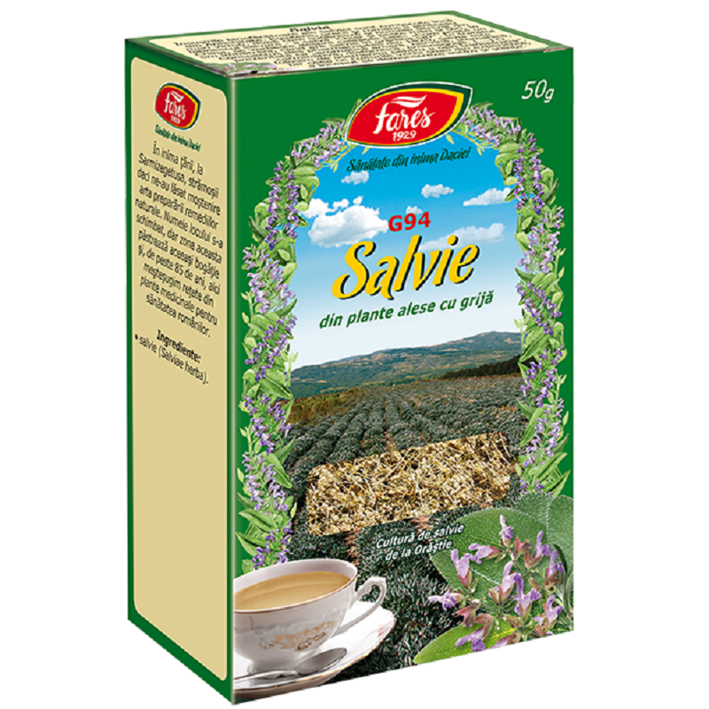 Ceai de salvie, 50 g, Fares [5941141001578] contribuie la reducerea disconfortului în perioada menopauzei; -ajută la moderarea funcţiei sudorifice, la reducerea transpiraţiilor abundente; -susţine o menstruaţie normală şi un ciclu regulat; -contribuie la uşurarea digestiei, la eliminarea gazelor şi reducerea balonării; -susţine sănătatea şi igiena mucoasei bucale; -susţine motilitatea normală a colecistului, reducerea contracţiilor intestinale neregulate; -ajută la reducerea iritaţiilor tractului respirator superior şi la uşurarea respiraţiei; -calmant al iritaţiilor gurii şi gâtului.