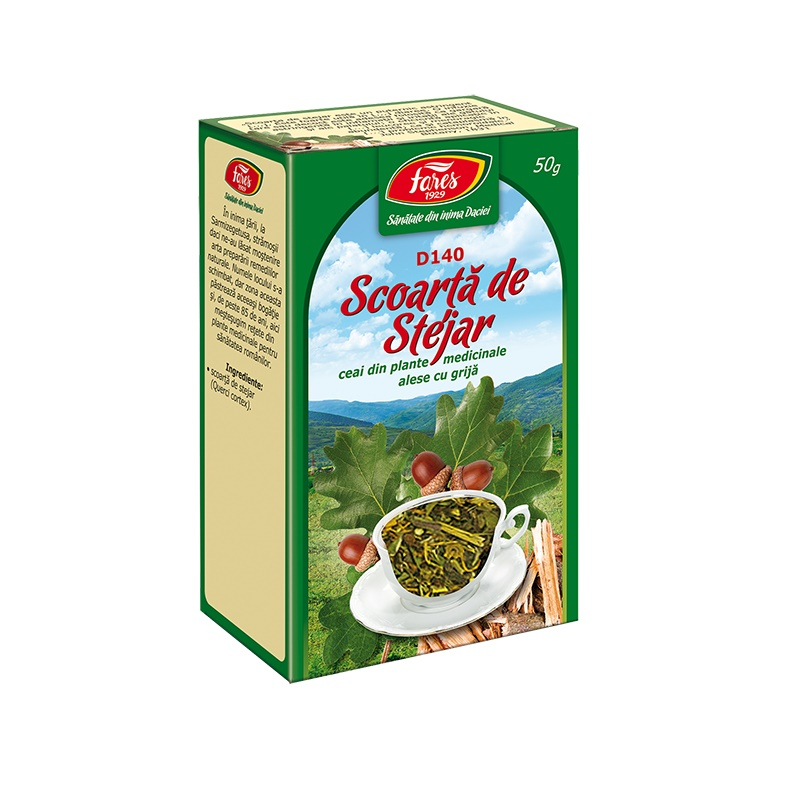 Ceai Stejar scoarță, D140, 50 g, Fares [5941141005583] Proprietăți: Ajută la menținerea sănătății pielii. Contribuie la confortul gurii și gâtului Susține sănătatea aparatului genital feminin. Ingrediente: Scoarța speciei Quercus robur, fam. Fagaceae, conține tanin, acid cvercitanic, acid elagic și galic, principii amare, cvercina, fluoroglucina, substanțe pectice. Efect: Astringent, antidiareic, hemostatic, antiinflamator, antibacterian Întrebuințări principale: Diaree acută. Alte întrebuințări: Inflamații ale gurii și faringelui, inflamații ale pielii, eczeme umede, dermatite, arsuri, degerături, ulcer varicos, hemoroizi, leucoree, hemoragii uterine, hemoptizie, melena, transpirații ale picioarelor Contraindicații: Sarcina, alăptare Preparare: Uz intern: decoct din 1 linguriță scoarță mărunțită la o cană cu apă. Uz extern: decoct concentrat din 3-4 linguri rădăcină mărunțită la 1 litru de apă. Mod de administrare: Uz intern: se beau 2-3 căni cu ceai pe zi.. Uz extern: gargară, comprese pe zona afectată, băi locale. Prezentare: 50 g