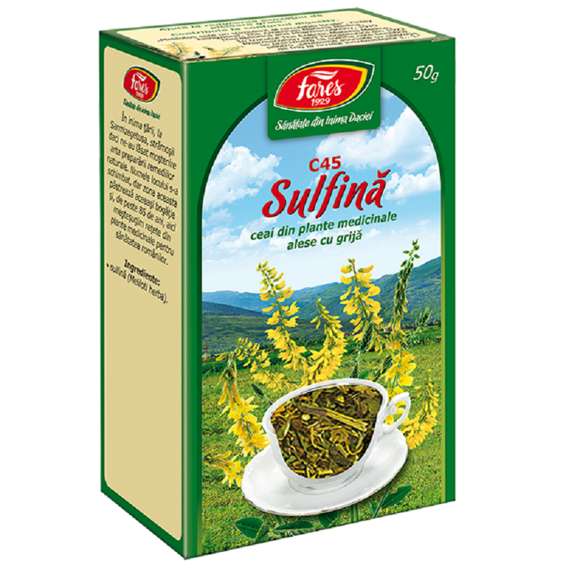 Ceai sulfină, 50 g, Fares [5941141001615] -susţine tonusul venos -ajută la reducerea senzaţiei de picioare grele -ajută la îmbunătăţirea circulaţiei periferice -ajută la protejarea, la menţinerea tonusului şi integrităţii vaselor sangvine, şi implicit la protejarea mucoaselor puternic vascularizate, în particular din zona perianală -ajută la păstrarea fluidităţii sângelui -susţine o tensiune sănătoasă, o stare generală de relaxare -susţine formarea şi contribuie la protejarea celulei hepatice -contribuie la eliminarea secreţiilor bronşice şi uşurarea respiraţiei -contribuie la protejarea mucoaselor gastro-intestinale