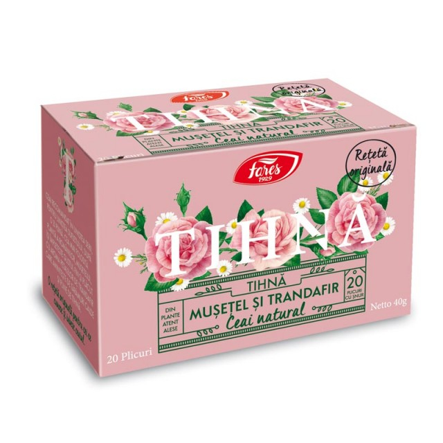 Ceai Tihna Musetel si Trandafir - 20 pliculete cu snur Fares Ceai pentru momente de tihnă. Rețeta are la bază cea mai folosită plantă a românilor – mușețelul. Se îmbină armonios cu aroma petalelor de trandafir. Ceaiul parfumat se recomandă a fi consumat seara. Pentru liniștea sufletului, după o zi încărcată. Infuzia este 100% naturală. Nu conține arome, coloranți și aditivi. Ingrediente: Flori de mușetel 43%, arome naturale, frunze de rooibos, coji de lime, cuișoare, petale de trandafir 1%, ulei esențial de mandarine.