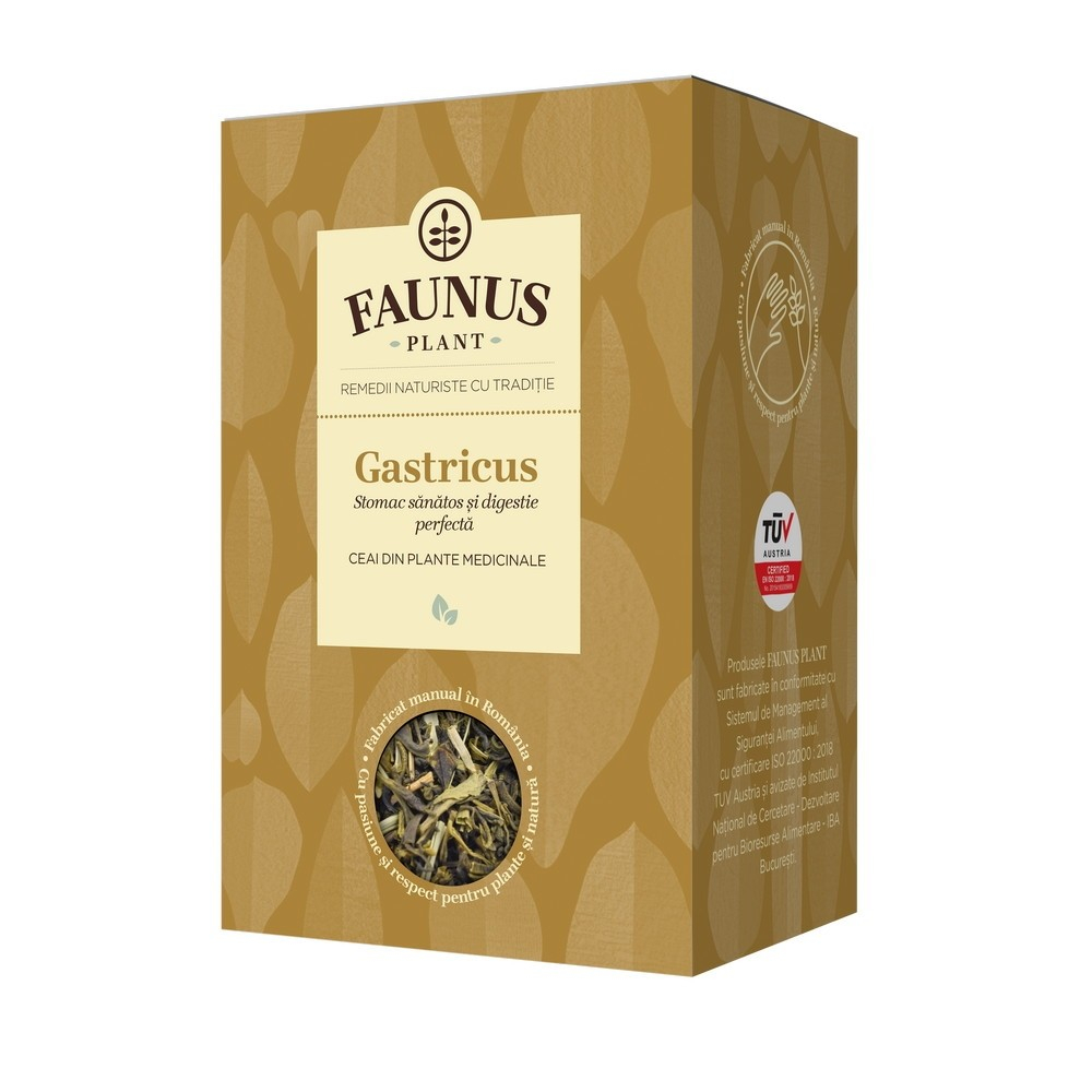 Proprietăți: diminuează aciditatea gastrică, antispastic, astringent, antiinflamator, cicatrizant. Recomandări: hiperaciditate gastrică (gastrită hiperacidă), ulcer gastric și duodenal, afecţiuni gastrointestinale cu componentă spastică (crampe abdominale, colici biliare), meteorism (balonare). Contribuie la: funcționarea normală a tractului gastrointestinal eliminarea disconfortului digestiv normalizarea secreţiei de suc gastric Ingrediente: Salcâm (Robinia pseudoacacia) flori (30%), Coada-calului (Equisetum arvense) părți aeriene (15%), Coada-şoricelului (Achillea millefolium) părți aeriene (15%), Gălbenele (Calendula officinalis) flori (15%), Pătlagină (Plantago major) frunze (15%), Sunătoare (Hypericum perforatum) părți aeriene (10%). Mod de administrare: Infuzie – se prepară din 2 linguriţe cu plante adăugate la 200ml de apă clocotită, se menţine timp de 15min. la temperatura camerei, apoi se strecoară. Se bea câte o cană cu infuzie de 3 ori pe zi, cu 30min. înainte de mese, pe stomacul gol. Durata unei cure obișnuite este de 1-2 luni. Pentru rezultate superioare, se recomandă folosirea în asociere cu tinctura GASTRICUS. Contraindicații: Sarcină, alăptare, alergie la oricare dintre componentele produsului. Produs 100% natural, obținut prin prelucrare manuală. Nu conţine conservanţi sau coloranţi artificiali. Produs avizat de SNPMAPS, notificare nr. 7887/2013.