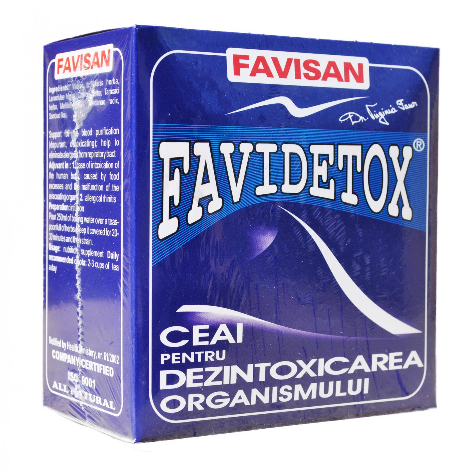 Ceai pentru dezintoxicarea organismului Favidetox, 50 g, Favisan [6421830003735] Este detoxifiliant, depurativ, diuretic, expectorant, antialergic, desensibilizant.Produsul este un excelent curațitor al sângelui. Recomandări: Folosind acest produs veți elimina excesul de acid uric, colesterol, toxine, tumori etc. Nu există produs care să aibă o acțiune detoxifiantă mai bine resimțită! De exemplu, în cazuri de reumatism, chiar și în cele mai avansate, aduce întotdeauna ameliorare. Și dacă nu știți ce organ este mai afectat, mai “intoxicat”, faceți o cură cu acest produs. Este o componentă importantă în tratamentul acneei, și descurajează orice dermatoză, eczemă, prurit, erupție cutanată, indiferent de originea lor. Este un laxativ ușor, neiritant, care nu dă dependență și, pe neașteptate, ușurează suferința chiar și acolo unde altă încercare a eșuat, cum se întâmplă, de obicei, în constipațiile rebele, asociate colitelor. În caz de rinite alergice, se fac băi de abur, apoi se fac spălături nazale. Nu mai este o noutate faptul că fiecare organism are un anumit grad de intoxicare, datorat modului de alimentație și de viață, în general. Nu ne referim la o intoxicație acută, cu un pește alterat, cu praf de ouă, cu un medicament sau cu altceva, ci la starea de intoxicare cronică a organismului datorită exceselor, alimentației deficitare în factori de protecție (antioxidanți naturali), nefuncționării corecte a organelor de eliminare. Toate bolile cronice, inclusiv cancerul, se furișează în atari situații. Trataterea și vindecarea oricărei maladii presupune adoptarea unei conduite de viață având, că țintă spre sănătate, dezintoxicarea. Este o iluzie să-ți propui să calmezi, să stimulezi și să reechilibrezi fără a trata cum se cuvine, pe cale naturală, netoxică, intoxicarea însăși. FAVIDETOX este utilizat în formula multor scheme de tratament ale bolilor cronice, având, ca origine, stilul greșit de viață. Mod de preparare și administrare: a) Se opărește o linguriță de produs (sau 1-2 pliculețe) cu 250 ml apă clocotită; se lasă 20-30 de minute acoperit, apoi se strecoară și se beau cu înghițituri rare, între mese, 2-3 căni pe zi. Prezentare: pungi de 50 g; cutii cu 20 plicuțele a 1,5 g Păstrare: la temperatura camerei, în locuri ferite de umiditate excesivă și de lumină solară directă