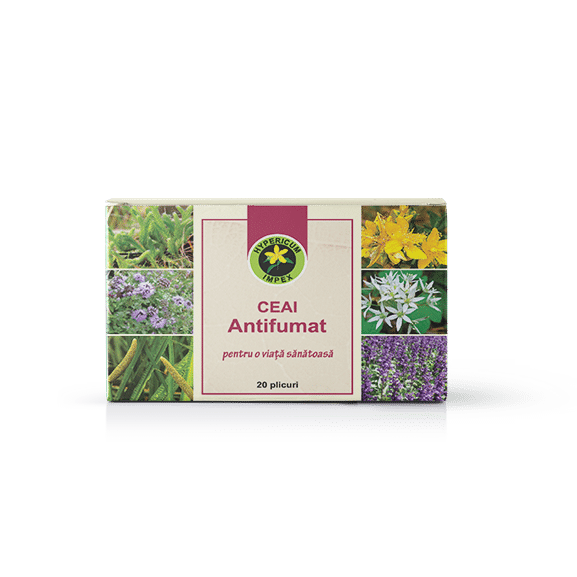 Ceai Antifumat, are un rol important in vitaminizarea si remineralizarea organismului, reface necesarul de vitamine si minerale Ceaiul Antifumat este recomandat si in: astenie fizica si intelectuala, ameteli, stare de neliniste, agitatie, tuse, tulburari digestive, migrene, pierderea memoriei, caracteristice abuzului de tutun. Cura antitabagica trebuie sa fie insotita de o vointa puternica, de odihna si de o alimentatie corespunzatoare. Proprietăți: Proprietati antitabagice, tonice si energizante, vitaminizante si remineralizante, calmante, depurative Ingrediente: Pedicuta(Lycopodium clavatum), Sunatoare (Hypericum perforatum), Catina-alba (Hippophae rhamnoides), Leurda (Allium ursinium), Obligeana (Acorus calamus), Busuiocul cerbilor (Mhenta pulegium), Salvie (Salvia officinalis). Mod de folosire: Intern – infuzie din 1-2 plicuri ceai la 200 ml apa fierbinte. Se beau 3 cani de ceai pe zi, inainte de masa.