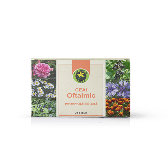Mentiuni de sanatate: Antiinflamatoare, antiseptica, astringenta, diuretica, protectoare a celulei vizuale, antiedematoasa. Caracteristici generale ale produsului: Adjuvant in ingrijirea sanatatii ochilor, prevenirea bolilor si in tratamentele oculare. Ceaiul intareste imunitatea ochilor impotriva agentilor infectiosi, inlatura scurgerile oculare, ajuta la vindecarea traumatismelor care s-ar putea transforma in boli, reda expresivitatea normala a ochilor la persoanele inaintate in varsta si la cei care citesc noaptea, ajuta la vindecarea conjunctivitelor si inflamatiilor oculare. Mod de folosire: Intern – infuzie din 1-2 lingurite planta (1-2 plicuri) la 200 ml apa fierbinte. Se consuma 2-3 cani de ceai pe zi in cure de 40 zile. Extern – infuzie din 3 lingurite (3 plicuri) ceai la 200 ml apa. Se lasa sa acoperit 3 minute, apoi se pun pe ochii inchisi comprese sterile cu infuzie timp de 30 de minute. Se repeta zilnic pana la rezolvarea problemelor oculare. Contraindicatii: Nu se administreaza persoanelor alergice la vreunul din ingredientele produsului. Precautii: A nu se depasi doza zilnica recomandata; A nu se lasa la indemana si la vederea copiilor; Acest supliment alimentar nu inlocuieste o dieta alimentara echilibrata si diversificata. Conditii de pastrare: Bine inchis, ferit de lumina si umiditate, la temperaturi de maxim 25°C.
