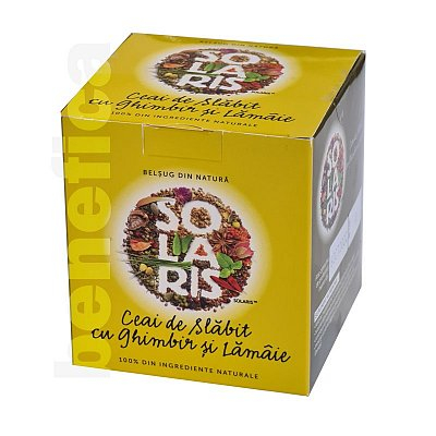CEAI DE SLABIT CU GHIMBIR SI LAMAIE, 20dz - SOLARIS CEAI DE SLABIT CU GHIMBIR SI LAMAIE confera organismului un plus de energie, favorabil arderii grasimilor - contribuie la eliminarea surplusului de apa din organism - ajuta la mentinerea siluetei, inhiband senzatia de foame. Ingrediente CEAI DE SLABIT CU GHIMBIR SI LAMAIE - SOLARIS in proportii variabile 60.2% (parti aeriene de Mate Herba Ilex paraguariesis, parti aeriene de Rooibos Aspalathus linearis, parti aeriene de menta Mentha piperita, parti aeriene de iarba de lamaie Cymbopogon citratus, radacina de Ghimbir Zingiber officinale, radacina lemn dulce Glycyrrhiza glabra, Fructe de Goji Lycium Barbarum), Frunze de Senna Cassia angustifolia 23.3%, parti aeriene de Volbura Convolvulus arvensis 11.33%, frucute Goji Lycium barbarum 5.2% Mod de administrare CEAI DE SLABIT CU GHIMBIR SI LAMAIE - SOLARIS - 1-2 cani pe zi, in cure de 3-4 saptamani, urmate de pause de 2 saptamani, numai pentru adulti. Curele de slabire trebuie sa fie insotite de o alimentatie corecta si echilibrata. se toarna apa clocotita intr-o cana in care se pune un plic de ceai. Se acopera cana si se lasa la infuzat 8-10 minute. Atentionari CEAI DE SLABIT CU GHIMBIR SI LAMAIE - SOLARIS A nu se lasa la indemana copiilor mici. Nu se recomanda copiilor, tinerilor sub 18 ani, femeilor insarcinate sau care alapteaza. A nu se depasi doza zilnica recomandata. A nu se lua concomitent cu alte produse recomandate in curele de slabire. A se consuma in maximum 2 luni de la deschiderea ambalajului. Mod de prezentare Cutie cu 20 plicuri Produs in Germania CEAI DE SLABIT CU GHIMBIR SI LAMAIE, 20dz - SOLARIS