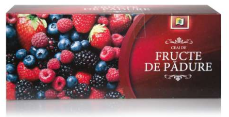 Ingrediente CEAI FRUCTE DE PADURE: flori hibiscus, faina macese, frunza zmeur, frunza afin, arome identic naturale. NU Contine coloanti. Culoarea rosie a ceaiului este culoarea naturala data de ingredientele mai sus mentionate. Actiune: ceai aromat, reconfortant, vitaminizant Mod de administrare: Se pune un plic într-o cana(250ml) peste care se toarna apa fierbinte. Se lasa acoperit 10-15 minute. Se foloseste indulcit dupa gust.