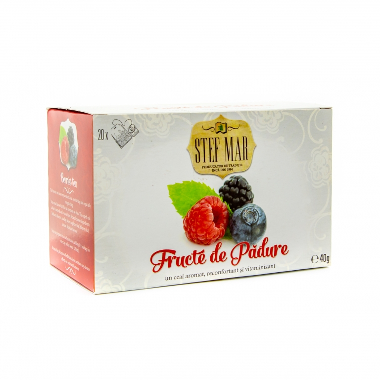 Ingrediente CEAI FRUCTE DE PADURE: flori hibiscus, faina macese, frunza zmeur, frunza afin, arome identic naturale. NU Contine coloanti. Culoarea rosie a ceaiului este culoarea naturala data de ingredientele mai sus mentionate. Actiune: ceai aromat, reconfortant, vitaminizant Mod de administrare: Se pune un plic într-o cana(250ml) peste care se toarna apa fierbinte. Se lasa acoperit 10-15 minute. Se foloseste indulcit dupa gust.