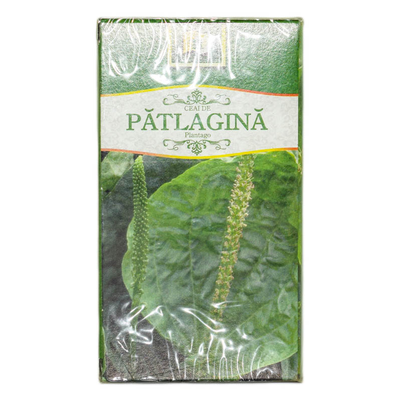 Proprietati ceai patlagina ( frunze ): are actiune emolienta, usor hemostatica si astringenta, antiinflamatoare, cicatrizanta, antibacteriana si diuretica. Indicatii ceai patlagina frunze : intern - in tratarea tuselor de diferite etiologii, bronsitelor cronice, astmului bronsic, ulcerului gastroduodenal si diareelor, arterosclerozei, diskinezie biliara extern - in tratamentul furunculozelor si abceselor, ulcerului varicos, conjunctivitelor si blefaritelor si pentru intepaturile de insecte. Compozitie ceai de patlagina , frunze ( Plantaginis Folium ): mucilag neozuronic (xiloza), vitaminele A,C,K,aucubozida, acid oleanoic, taninuri, flavone, fitosteroli. Mod de utilizare ceai de patlagina : Intern - infuzie 2-5 % ( o lingura de frunze la 200 ml apa clocotita), o lingura la 2 ore ; in ulcer gastric, se utilzeaza 0,5 g pulbere de frunze de 2-3 ori pe zi, dupa mesele principale ; Extern - gargara, cataplasme, spalaturi locale cu infuzie obtinuta din 2 linguri de pulbere planta la 200 ml apa clocotita.