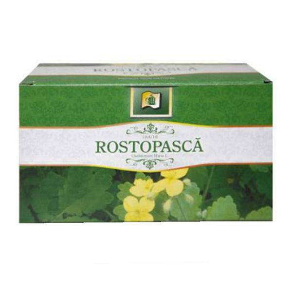Descriere Ceai Rostopasca Iarba 20 DZ de la STEFMAR Actiune CEAI ROSTOPASCA: Stimulent al functiei hepatice, calmant al colicilor hepato-biliare, sedativ si narcotic al centrilor nervosi superiori, coleretic-colagog, antitumoral (prin actiune mitoclazica), dezinfectant si cicatrizant. Mod de preparare si administrare: Infuzie (1/2 lingurite la cana) care se bea in cursul zilei. Contraindicatii: Prin supradozare planta devine toxica Contine: Rostopasca