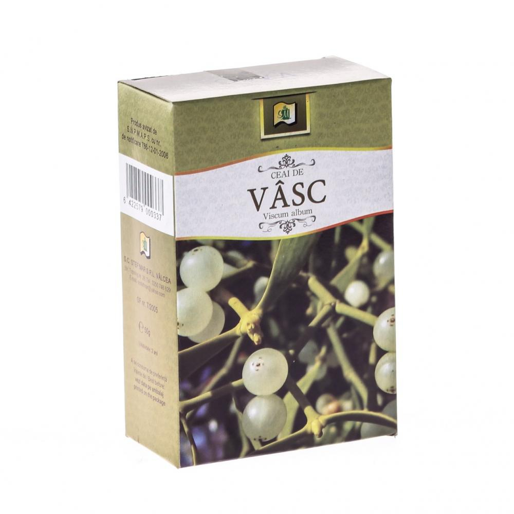 Proprietati ceai vasc : Datorita substantelor de natura triterpenica, derivatilor: colina si viscotoxina, vascul are proprietati hipoten-sive puternice (scade tensiunea arteriala) si cardiotonice. Este vasodilatator coronarian si periferic; are activitate bradi-cardizanta (bradicardie imediata si tardiva in tahicardii).Intern, vascul are proprietatea de a influenta circulatia sangelui, facand sa scada tensiunea (hipotensiv), aduce o ameliorare in ateroscleroza, tulburari renale determinate de o tensiune ridicata.Planta are o actiune antispasmodica, calmand crizele de astm, tusea convulsiva si sughiturile persistente.Administrare ceai de frunze de vasc :Uz intern: - sub forma de macerat, 3 lingurite de planta maruntita la 200 ml apa rece, se lasa 8 ore la macerat; se strecoara si se indulceste; nu se fierbe. Se pot lua 3-4 cesti pe zi, din care una seara la culcare. - tratamentul se poate face si cu frunza de vasc, maruntita sub forma de pulbere, din care se iau 4 varfuri de cutit pe zi.Compozitie :Frunze de Vasc (Folium Visci).