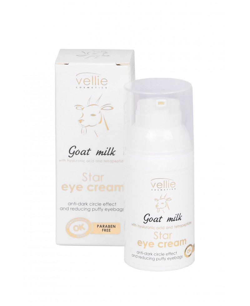 Crema pentru ochi Vellie Goat Milk, cu extract din lapte de capra, 30ml Crema pentru ochi contine o formula unica, special aleasa care reduce ridurile, urmele si pungile de sub ochi, dandu-i pielii un aspect natural si sanatos. Protejeaza pielea din zona ochilor impotriva uscarii. Dedicata pentru pielea uscata si sensibila atat a femeilor cat si a barbatilor. Formula este absorbita rapid de catre piele si contine extract din lapte de capra, acid hialuronic si ulei de argan. Tetrapeptidele reduc pungile de sub ochi. Imbogatita cu: Acid Hialuronic, Ulei de Argan, tetrapeptide. Produs testat dermatologic. Are un pH neutru.