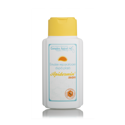 Emulsia reparatoare dupa plaja Apidermin Sun calmeaza si repara pielea dupa expunerea la soare. Datorita formulei bogate in ingrediente de origine naturala, emulsia Apidermin Sun ofera o senzatie de confort si rasfat. Ingredientul activ principal, alantoina, alaturi de glicerina asigura o hidratare optima. Alantoina, ajutata de vitamina E si untul de shea vindeca simptomele de iritare a pielii si disconfort dupa plaja. Structura fina a uleiul de catina ii permite o actiune hranitoare in straturile profunde ale pielii. Uleiul de migdale dulci reda stralucirea naturala a pielii Laptisorul de matca, hrana regala, complex de vitamin B, C, D si E , este o substanta naturala cu numeroase principii nutritive, fiind un concentrat biologic bogat in substante proteice: lipide, glucide si vitamine, activand circulatia sangelui. Datorita actiunii de regenerare asupra celulelor, laptisorul de matca este una dintre cele mai puternice substante naturale cu efect anti-aging. Utilizare Se aplica dupa plaja in cantitate uniforma pe toata suprafata pielii expuse la soare, prin masaj usor. Pentru protectia pielii pe parcursul expunerii la soare este recomandata emulsia pentru plaja SPF 30 Apidermin Sun. Ingrediente: Aqua, Cetearyl Alcohol, Coco Caprylate/Caprate, C12-15 Alkyl Benzoate, Glyceryl Stearate, Glycerin, Stearic Acid, Allantoin, Prunus Amygdalus Dulcis Oil, Butyrospermum Parkii Butter, Tocopherol, Royal Jelly, Hippophae Rhamnoides Dulcis Oil, Caprylyl Glycol, Decylene Glycol, Sodium Lauroyl Glutamate, Dipropylene Glycol,Phenoxyethanol, Parfum, Tetra Sodium EDTA.