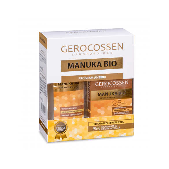 Caseta cadou este formata din: - Crema intens hidratanta 25+ Manuka Bio 50 ml - Apa micelara 3 in 1 Manuka Bio 300 ml Gama GEROCOSSEN MANUKA BIO contine produse cosmetice personalizate in functie de necesitatile fiecarei varste, oferind pielii dupa utilizare un aspect tanar și catifelat. Mierea de Manuka BIO este ingredientul perfect pentru ingrijirea pielii: - hidrateaza in profunzime - regenereaza pielea si ii reda elasticitatea Alte informatii: Tip ten: toate tipurile de ten Utilizare: in fiecare zi Varsta: 25+ Testat Dermatologic BENEFICII Asigura echilibrul normal al pielii Hidratare intensa Lotiunea micelara curata impuritatile si demachiaza Netezirea pielii MOD DE UTILIZARE Se aplica crema pe fata curatata in prealabil cu lotiune micelara si se maseaza pana la absorbtie completa. INGREDIENTE CONTINE Miere de Manuka Bio Ulei de avocado Unt de shea Listele complete de ingrediente pot fi consultate in paginile individuale ale produselor ce fac parte din aceasta caseta.