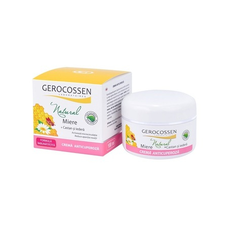 Crema anticuperoza Gerocossen Natural, 100 ml Formula speciala pentru ingrijirea tenului sensibil, cuperozic, cu vase capilare dilatate si sparte. Realizata pe baza unui complex activ natural format din castan si iedera, aceasta crema mareste rezistenta vaselor capilare fragile, activeaza microcirculatia si reduce aparitia rosetii. Imbogatita cu miere, ulei de masline si avocado, crema hraneste epiderma, o hidrateaza si ii reduce sensibilitatea la factorii externi.Folosita zilnic, crema are ca efect reducerea cuperozei.