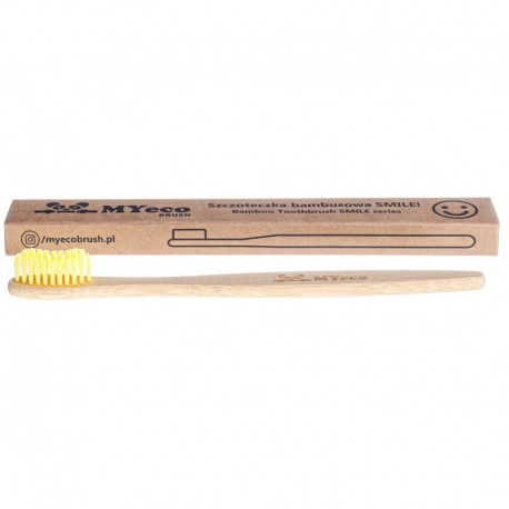 Periuta de Dinti din Bambus marca MYeco din seria de produse `Smile` (zambet sau suras), pentru adulti si adolescenti. Subtire, cu perii de culoare galbena si maner elegant din bambus, este usor de manevrat si se potriveste bine in mana, asigurand un confort si mai mare la periere. MyEcoBrush (in traducere directa, peria mea ecologica) va asigura produse naturale, pentru profilaxie! Peria de dinti este fabricata din lemn de bambus biodegradabil, are perii cu grad de duritate `moale` din nailon 610 cu 65% ingrediente ecologice, sigur pentru mediu, fara BPA (bisfenolul A, nociv). In plus, fiecare perie este ambalata intr-o cutie de carton din hartie reciclata si, impreuna cu ambalajul din carton, este ecologica. Curata perfect dintii si spatiile interdentare, fara sa irite gingiile, fiind recomandata persoanelor care cauta o perie delicata pentru a-si curata dintii. Recomandari: Periutele sunt potrivite pentru curatarea temeinica a dintilor, protejand totodata gingiile. Firele periutei sunt foarte moi, ideale pentru gingiile sensibile, chiar si atunci cand le folositi mai dur.