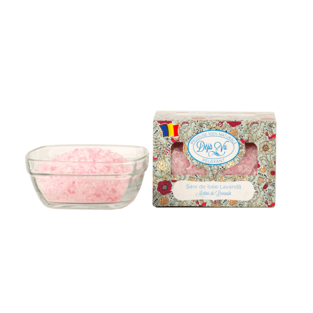 Sare de Baie Lavanda Deja Vu, 500g: sare de baie cu efect relaxant, cu o formula 100% naturala, imbogatita cu uleiuri esentiale, ce calmeaza, curata si revitalizeaza epiderma, eliminand senzatia de oboseala. Uleiul esential de lavanda are o actiune relaxanta atat la nivelul pielii cat si asupra creierului, destinde si rasfata simturile, uleiul esential de ylang ylang relaxeaza sistemul nervos iar uleiul esential de grapefruit stimuleaza eliberarea endorfinelor, ce declanseaza senzatia de bucurie, fericire si optimism. Sarea de mare purifica organismul eliminand toxinele, stimuleaza metabolismul, activeaza functiile epidermei si are o actiune de deschidere a porilor pentru a facilita absorbtia ingredientelor benefice care ofera o ingrijire optima. Ingrediente: sare de mare, ulei esential de lavanda, ulei esential de ylang-ylang, ulei de grapefruit, ulei vegetal de masline, colorant alimentar natural Mod de utilizare: se adauga 100g produs in 30 litri de apa calda. Cantitate: 500 g. Brand: Deja Vu