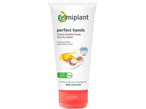 Cremă reparatoare de mâini, 100 ml, Elmiplant [5943048003150] Crema Reparatoare pentru Mâini Elmiplant conferă îngrijire imediată și hrănire mâinilor foarte uscate și aspre printr-o formulă nouă, extrem de eficiență. Beneficiază de această formulă cu efect intens, care hrănește și repară pielea foarte uscată, redându-i catifelarea și elasticitatea. Mierea, un ingredient nutritiv natural, bogat în vitamine și minerale, contribuie la menținerea echilibrului optim de hidratare și la întărirea protecției naturale a pielii. Uleiul de Macadămia, bogat în acizi grași, protejează și repară textura pielii. Se absoarbe rapid, calmând pielea foarte uscată și redându-i confortul și elasticitatea. Folosire: Aplicați pe mâini de mai multe ori pe zi. Rezultate optime se obțin în special noaptea, când mâinile nu intră în contact cu apă.