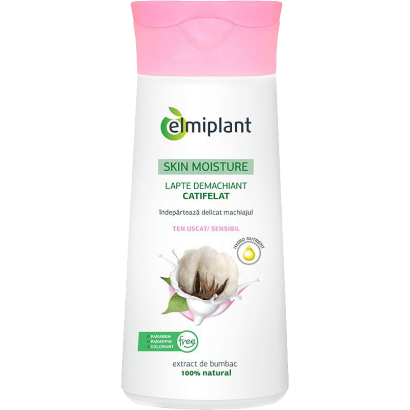 Lapte Demachiant Catifelat Elmiplant Skin Moisture Pentru Ten Uscat / Sensibil 200 ml Natura a reprezentat intotdeauna sursa noastra de inspiratie! Formulele noastre sunt imbogatite cu ingrediente 100% naturale obtinute prin metode blande, eco-friendly, ce asigura pastrarea proprietatilor substantelor active. Elmiplant SKIN MOISTURE iti respecta tenul. Toate produsele sunt testate dermatologic, fara parabeni si fara parafine. Bogat in proteine si minerale, Extractul de Bumbac ajuta eficient la protejarea pielii sensibile, restabilindu-i catifelarea si supletea. Intretine frumusetea pielii cu Vitamina E, un eficient agent antioxidant cunoscut pentru proprietatile sale reparatoare. Actiune: Indeparteaza eficient impuritatile si machiajul, in timp ce textura sa cremoasa hidrateaza eficient pielea, prevenind aparitia iritatiilor. Utilizare: Se aplica pe ten, folosind o discheta demachianta si se maseaza usor pentru a indeparta impuritatiile si machiajul.