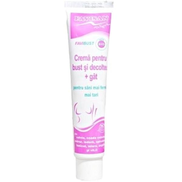 Crema pentru Bust, Decolteu si Gat Favibust Favisan, 75ml: crema pentru ingrijirea zonei bustului, decolteului si a gatului, cu o formula imbogatita cu extracte naturale din salvie, coada calului, marar, iedera, spirulina si fenicul, ce asigura o buna functionare glandulara, ajuta la remodelarea naturala a sanilor si le confera fermitate. Argila, mierea si vitamina C contribuie la infrumusetarea pielii, hidratand-o intens, stimuland regenerarea acesteia si lasand-o elastica si catifelata. Are o formula usoara ce se absoarbe rapid fara a lasa pielea grasa sau lipicioasa. Ingrediente: extracte naturale din salvie, coada calului, marar, iedera, spirulina si fenicul, argila, miere si vitamina C Aplicare: se aplica pe sani, decolteu si gat, masand usor pana la absorbtie. Cantitate: 75 ml. Brand: Favisan