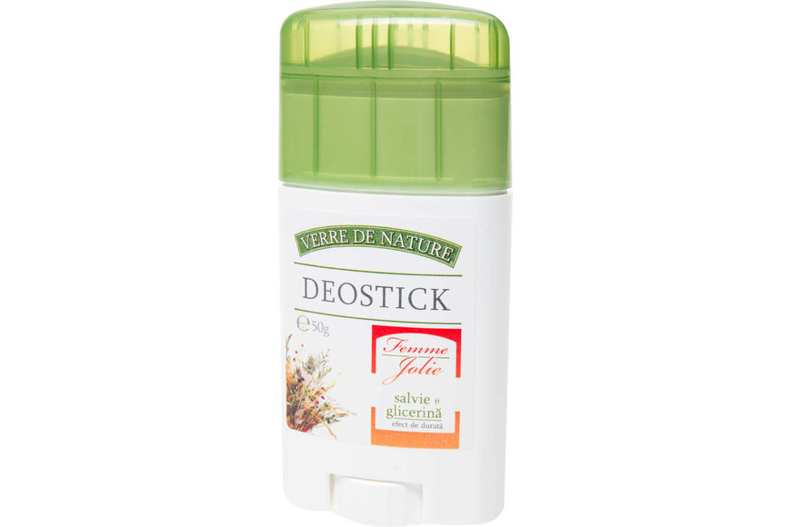 Deostick Verre De Nature Femme Jolie 50g Gama VERRE DE NATURE inseamna produse fabricate manual, printr-un procedeu ce pastreaza toate elementele nutritive. Contin uleiuri vegetale fine cu efect tonic si regenerant. Deodorant solid cu extract natural de salvie, glicerina si provitamina B5. Extractul de salvie asigura o protectie continua timp de 24 de ore, reduce transpiratia si impiedica aparitia mirosului neplacut. Ingrediente: Propylene glycol,Sodium stearate,Apa, Salvia officinalis extract,Glycerin,Cetyl stearyl alcohol,Sodium chloride,Parfum,Panthenol,Tetrasodium EDTA,Hexyl cinnamaldehyde,Benzyl salicylate,Lilial,Linalool,Limonene ,Methyl ionons,Lyral,Citronellol,Geraniol. Nu conține: - săruri de aluminiu - parabeni sau alți conservanți - alcool etilic sau coloranți.