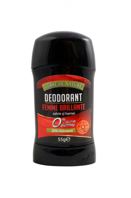 Deostick cu salvie, hamei si nalba Femme Brillante - 55 g 0% saruri de aluminiu. Asigura protectie in perioada activa a zilei, inhiba dezvoltarea bacteriana, reduce transpiratia fara sa blocheze porii si neutralizeaza mirosul neplacut. Este special formulat cu 20% ingrediente hidratante si parfum placut, oferind o senzatie de confort si prospetime. Utilizare: aplicati pe pielea curata si uscata. A nu se aplica pe piele lezata sau iritata. Daca apar iritatii, se intrerupe utilizarea. Nu contine: Saruri de aluminiu; Parabeni sau alti conservanti; Alcool etilic si coloranti. Ingrediente (INCI): Propylene glycol, Glycerin, Sodium stearate, Aqua, Potassium laurate, Potassium cocoate, Salvia officinalis extract, Humulus lupulus extract, Potassium olivate, Potassium castorate, Cetylstearyl alcohol, Tetrasodium glutamate diacetate, Zinc ricinoleate, Sodium chloride, Althaea officinalis extract, Parfum, Panthenol, Propanediol, Limonene, Hexyl cinnamal, Benzyl benzoate, Tocopheryl acetate. Produs testat dermatotologic.