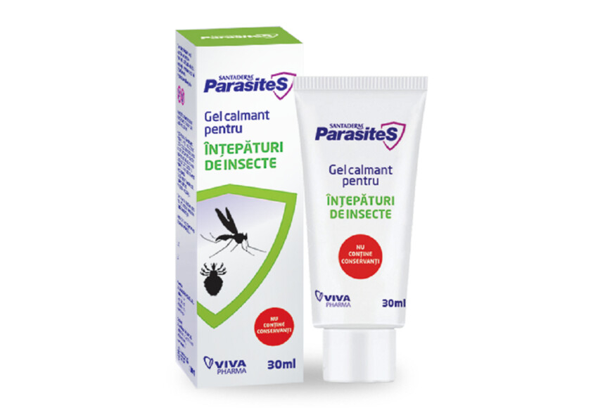 Gel calmant pentru intepaturi de insecte Parasites Santaderm, 30 ml, Viva Pharma [6425013000887] Gel calmant pentru intepaturi de insecte Parasites Santaderm Proprietati: - calmeaza rapid mancarimea si iritatia pielii cauzate de intepaturile sau muscaturile insectelor; - are efect antiseptic si da senzatia de racorire pe zona de piele afectata, datorita combinatiei de uleiuri esentiale de menta, lavanda, muscata, rozmarin, cuisoare si ceai verde pe care le contine, precum si a extractelor de Litsea cubeba, lemongrass, wintergreen si a terpineolului. Mod de utilizare: Imediat dupa intepatura, aplicati o cantitate suficienta de gel pe zona de piele afectata si masati usor. Repetati aplicarea gelului calmant de 3-4 ori pe zi, pana cand senzatia de mancarime si usturime, precum si iritarea pielii in locul intepaturii sau muscaturii dispar. Poate fi utilizat zilnic de catre adulti si de catre copii cu varsta mai mare de 3 ani. Prezentare: 30 ml