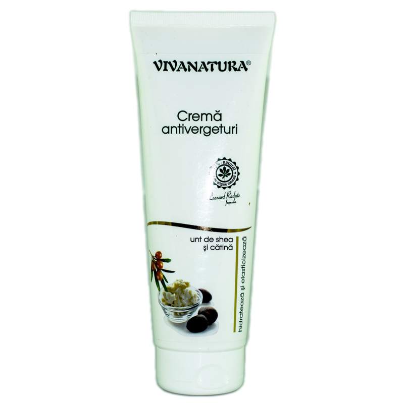 Vergeturile sunt afectiuni inestetice ale pielii care nu au manifestari dureroase, fiind in special o problema de ordin cosmetic. Vergeturile se formeaza in urma ruperii tesuturilor subcutanate (a fibrelor conjunctive) datorita intinderii rapide a tesutului. Ele au aparenta usor cicatrici rozalii sau rosiatice, iar apoi se estompeaza, devenind cu cateva tonuri mai deschise decat culoarea naturala a pielii. Vergeturile apar de obicei la majoritatea feteilorinsarciante, mai ales la nivelul coapselor si abdomenului, de asemenea la adolescentele aflate la pubertate, la persoanele cu fluctuatii in greutate. Zonele de risc unde vergeturile apar de cele mai multe ori sunt coapsele, soldurile, gambele, fesele, sanii, abdomenul sau partea superioara a bratelor. ?Vergeturile pot si prevenite, dar si tratate in primele faze de aparitie, iar cu cat actionam mai repede asupra lor cu atatsansele sa dispara sunt mai mari. ?Datorita compozitiei bogate in uleiuri naturale si ingrediente active Crema antivergeturi cu unt de shea si catina Vivanatura are in puternic efect asupra straturilor profunde ale pielii, ajutand la restaurarea functiilor celularesi a unei microcirculatii corecte. Crema antivergeturi Vivanatura previne aparitia vergeturilor si stimuleaza regenerarea celulara.