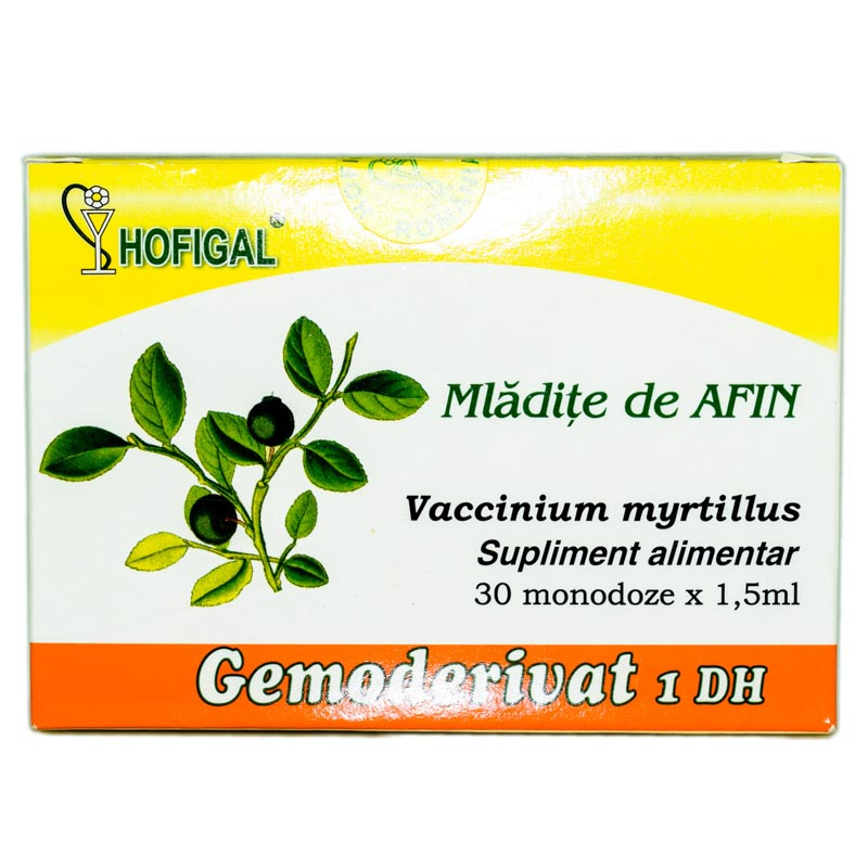 Mlădițe de Afin, Hofigal, 30 monodoze Ingrediente: o monodoza de 1,5 ml conține extract glicerinohidroalcoolic 1DH din mlădițe proaspete de afin (Vaccinium myrtillus). Conține alcool etilic de cereale 45% în vol. Acțiune benefică asupra: retinei, sistemului vascular, intestinului și aparatului urinar, metabolismului glucidic și purinic. Proprietăți: de protecție a circulației periferice (arteriolară și capilară), de regenerare a microcirculatiei retiniene și de sensibilizare a fotoreceptorilor; este un bun drenor renal și pancreatic, util în diverse tulburări metabolice. - menținerea funcției vizuale, având efect benefic în tulburări de vedere cu diminuare a acuității vizuale și a câmpului vizual; efect benefic pentru protecția oculară împotriva radiațiilor; - susține sănătatea vasculară, prin reducerea stărilor de fragilitate și alterare a permeabilității vasculare; - stimulează metabolismele glucidic și purinic, influențând pozitiv normalizarea glicemiei și reducerea excesului de uree din sânge; - are influență pozitivă în funcționarea normală a tractului digestiv, îmbunătățind digestia și reglarea tranzitului intestinal, atenuează fermentația intestinală excesivă și stimulează eliminarea gazelor formate; - protejează celulele și țesuturile organismului de acțiunea nocivă a radicalilor liberi; - favorizează regenerarea și reepitelizarea mucoaselor; - acțiune eutrofica asupra țesutului conjunctiv cutanat. - asigura starea generală de bine. Produsul este foarte bine tolerat, fără contraindicații semnalate până acum la dozele și ritmul de administrare recomandate. În sarcina și perioada de alăptare, copii până la vârstă de 7 este necesară recomandarea specialistului. La apariția unor efecte nedorite se întrerupe administrarea produsului și se recomandă consultarea medicului sau farmacistului. Instrucțiuni de utilizare: - câte 1 monodoza de 1,5 ml diluată în puțînă apă (o lingură), de 2-3 ori pe zi, cu 15 minute înainte de mesele principale sau după recomandarea specialistului. Preparatul diluat se ține câteva secunde în gură pentru favorizarea absorbției prin mucoasa bucală și, apoi se înghite treptat. Se poate asocia și cu alte extracte glicerinohidroalcoolice la recomandarea specialistului. Produsul este un supliment alimentar și nu trebuie să înlocuiască o dietă variată și echilibrată și un stil de viață sănătos. Prezentare: cutie pliantă conținând 30 monodoze de 1,5 ml extract glicerinohidroalcoolic. Condiții de păstrare: A se păstra la temperatura camerei (15-25°C), ferit de umiditate și lumina, în ambalajul original ! A nu se depăși doză recomandată pentru consumul zilnic ! A nu se utiliza după dată de expirare înscrisă pe ambalaj ! A nu se lasă la îndemână și vederea copiilor mici !