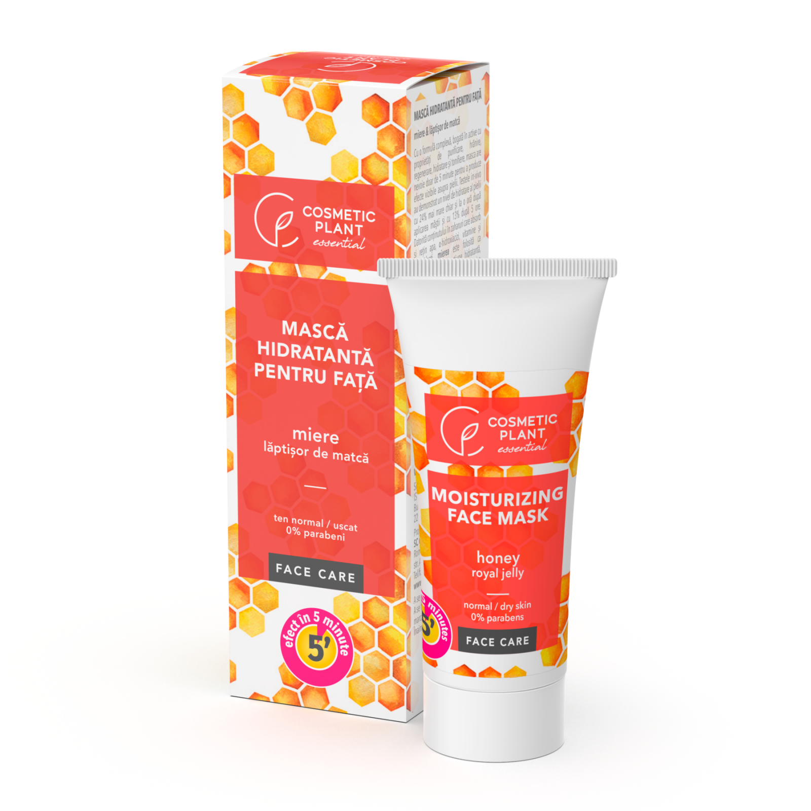 Cu o formulă complexă, bogată în active cu proprietăți de purificare, hrănire, regenerare, hidratare și tonifiere, masca hidratantă pentru față cu miere și lăptișor de matcă are nevoie doar de 5 minute pentru a produce efecte vizibile asupra pielii. Datorită conținutului în zaharuri care absorb și rețin apa, α-hidroxiacizi, vitamine și antioxidanți, mierea este folosită ca umectant natural cu acțiune hidratantă, antiinflamatoare și de protecție împotriva radicalilor liberi, în timp ce Lăptișorul de matcă, vitaminele A, F, B5 și untul de cacao au proprietăți emoliente, protectoare și de tonifiere a pielii. Mod de utilizare: Masca se aplică pe pielea curată a feței, gâtului și decolteului într-un strat uniform și suficient de gros, evitând conturul ochilor. Se lasă să acționeze 5 minute, după care se clătește cu apă din abundență. Se poate utiliza de 1-2 ori pe săptămână, în funcție de necesitate. Pentru rezultate optime în îngrijirea tenului se recomandă folosirea în combinație cu Crema de zi catifelantă, Crema de noapte revitalizantă, Crema contur ochi și Laptele demachiant hidratant din aceeași gamă. 0% parabeni
