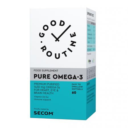Proprietati: Supliment alimentar Pure Omega-3, GOOD ROUTINE®, 60 capsule moi, pe baza de Acizi Grasi Omega-3 (1430 mg), pentru sanatatea inimii si a creierului. Formula concentrata pe baza de Acizi Grasi Omega-3 (1430 mg), caracterizata prin puritate inalta si absorbtie crescuta, pentru sanatatea inimii, a vederii si a creierului. Avantaje: Puritate inalta - Platforma tehnologica patentata Flutex™ antreneaza un proces de purificare in 4 pasi care asigura inlaturarea metalelor grele si a altor contaminanti - fara utilizarea solventilor, a temperaturilor inalte sau a altor metode agresive Biodisponibilitate inalta - sustinuta de forma naturala, trigliceridica, stabila sub care se regasesc incorporati Acizii Grasi Omega-3, asigurand absorbtia la nivelul membranelor celulare Formula premium, concentrata - fiecare administrare asigura concentratii inalte din acesti nutrienti esentiali: EPA 792 mg & DHA 528 mg Compozitie/1 capsula: Ulei de peste (sursa de Omega-3, min 65%) furnizand: 2200 mg Omega-3 1430 mg EPA 792 mg min. 36% (acid eicosapentaenoic) DHA 528 mg min. 24% (acid docosahexaenoic) Alti acizi grasi Omega-3 110 mg Vitamina E 13.42 mg (d-alfa tocoferol) Vitamina D3 5 mcg /200UI (colecalciferol) Mod de administrare: 2 capsule/zi, la masa, cu 200 ml apa sau conform recomandarii consultantului de specialitate.