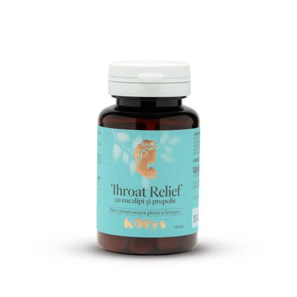 Throat Relief cu eucalipt și propolis de la Kotys este un supliment alimentar sub formă de comprimate de supt, conceput pentru calmarea gâtului și susținerea confortului respirator.
