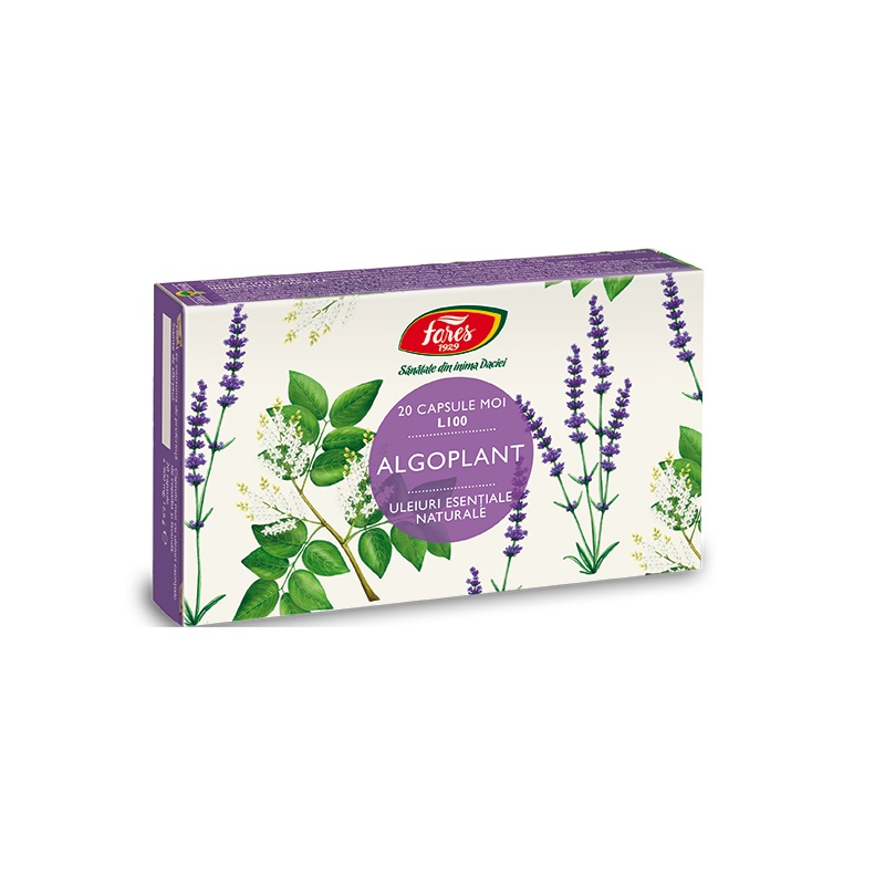 Algoplant, L100, 20 capsule, Fares [5941141013502] Proprietăți: - recomandă persoanelor cu cefalee și migrene; - compoziție unică din 9 uleiuri esențiale, ce asigură efect și absorbție rapidă; - reduce frecventa, intensitatea și durata durerilor de cap; - efectul antialgic este dat de acțiunea antiinflamatorie intensă, cât și de acțiunea directă asupra receptorilor specifici durerii; - efect scontat în maxim 1 ora de la prima administrare; - nu generează hepatotoxicitate, edeme sau rezistență și dependență la tratament; - produsul este 100% natural, fără excipienți, asigurând o biodisponibilitate optimă; - turmericul susține funcționarea sistemului nervos și calmează durerile inflamatorii, favorizând un bun echilibru mental; - smirnă ajută la păstrarea confortului la nivelul capului și susține funcția nervoasă; - tămaia ajută la îmbunătățirea funcției mentale; - mentă și lavanda contribuie la o relaxare optimă; - lavanda ajută la reducerea tensiunilor, iritabilității și a agitației. Ingrediente active: Ulei vegetal de floarea soarelui 100 mg, ulei vegetal de negrilică (Nigella sativa oleum) 100 mg, ulei esențial de Betula alleghaniensis 28 mg, ulei esențial de turmeric (Curcumae longae aetheroleum) 28 mg, ulei esențial de lavanda (Lavandulae aetheroleum) 28 mg, ulei esențial de copăibă (Copaiferae aetheroleum) 20 mg, ulei esențial de mentă (Menthae piperitae aetheroleum) 20 mg, ulei esențial de lemongras (Cymbopoginis citrati aetheroleum) 20 mg, ulei esențial de cuișoare (Caryophylli floris aetheroleum) 20 mg, ulei esențial de smirna (Commiphorae myrrhae aetheroleum 20 mg, ulei esențial de tămâie (Boswelliae aetheroleum) 16 mg. Mod de administrare: 1 capsula pe zi la nevoie. Dacă după prima utilizare aveți nevoie de un efect mai intens, în decurs de o oră puteți să mai luați încă o capsulă. 2 capsule pe zi, timp de o lună pentru eliminarea disconfortului persistent la nivelul capului. Cura se poate repeta la nevoie, după o pauză de 2 - 4 săptămâni. Precauții: Nu se recomandă în caz de gastrită acută, ulcer gastroduodenal acut, hiperaciditate, reflux gastroesofagian, copiilor sub 7 ani și în caz de hipersensibilitate la oricare dintre ingredientele produsului. Nu se recomandă femeilor însărcinate datorită unor posibile efecte de stimulare a contracțiilor uterine. Nu se recomandă mamelor care alăptează datorită faptului că substanțele active trec în laptele matern și pot modifica gustul acestuia. Prezentare: 20 capsule