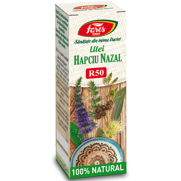 Ulei Hapciu Nazal, R50, decongestionant nazal - Formula complexă din 10 uleiuri esențiale ajută la desfundarea rapidă a nasului și contribuie la imbunătățirea respirației. Asocierea a două specii de uleiuri esențiale de eucalipt, globus și radiata, contribuie la desfundarea rapidă a nasului, in timp ce uleiul de copaiba protejează mucoasa. Mucoasa nazală este protejată și de aplicarea externă care se face ușor, datorită sticlei cu roll on. Uz extern. BENEFICII Ajută la desfundarea nasului și contribuie la imbunătățirea respirației Acționează rapid Protejează mucoasa nazală Rețeta complexă doar din uleiuri esențiale Produs 100% natural Arii de acțiune: Nas înfundat, Respirator Ingrediente: ulei vegetal de cocos (Cocos nucifera) uleiuri esenţiale de: eucalipt (Eucalyptus globulus şi Eucalyptus radiata), mentă (Mentha piperita), lemon verbena (Lippia citriodora), mirt (Myrtus communis), pin (Pinus sylvestris), rozmarin (Rosmarinus officinalis), dafin (Laurus nobilis), copaiba (Copaifera reticulata), calomfir (Chrysanthemum balsamita), trigliceride caprilice/caprice. Mod de administrare: Se deşurubează capacul de protecţie, se poziţionează sticluţa în dreptul nasului şi se inspiră adânc alternativ pe fiecare nară, direct din sticluţă (după ce se rulează bila). Se mai poate aplica la baza nasului. Se foloseşte de câte ori este nevoie pe zi. A nu se folosi la copii sub 3 ani. Citiţi cu atenţie prospectul înainte de utilizare. ASOCIERI RECOMANDATE: Pentru reducerea disconfortului respirator HAPCIU NAZAL -R50 se poate asocia cu unul sau mai multe dintre produsele: capsule Biosept-A5, tinctura Biosept-A4, Biomicin Forte -A3/A15, Biomicin -A2/A14, produsele din gama Hapciu si gama Plantusin, ceai Plantusin -R1, ceai Bronhofit (Uşurarea respiraţiei)-R1, ceai P-Pulmonar -R14.