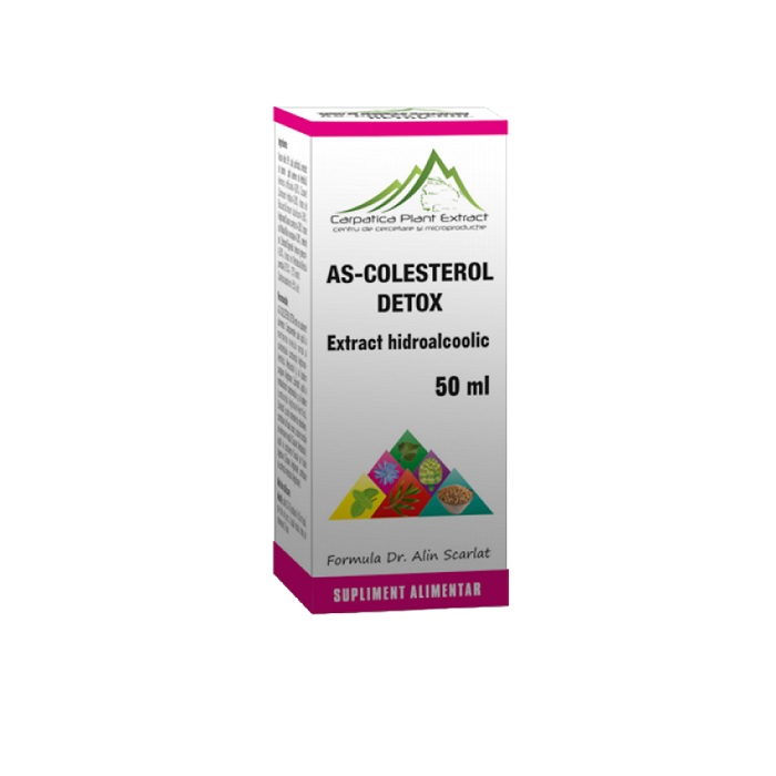 AS-COLESTEROL DETOX este un supliment alimentare care, prin componentele sale, ajută la menținerea nivelului normal al colesterolului și al lipidelor sanguine, ajută la metabolismul colesterolului și al lipidelor; susțin sistemele de detoxifiere: contribuie la fluxul urinar, susține funcțiile de eliminare renală, ajută la susținerea fluxului de fluide digestive, contribuie la confortul intestinal. Ingrediente: Alcool etilic, apă purificată, amestec de plante: Ventrilică/Veronica officinalis, Cicoare/Cichorium intybus, Busuioc/Occinum basilicum, Anghinare/Cynara scolymus, Măslin/Olea europaea, Schinduf/Trigonella foenum-graecum, Mesteacăn/Betula pendula Mod de utilizare: Adulți: câte 20-30 picături în 50 ml apă, de trei ori pe zi, după masă, timp de minimum 3 luni. Atenționări: Nu se utilizează de către copii mai mici de 12 ani! A nu se consuma de către femei însărcinate sau în perioada de alăptare.