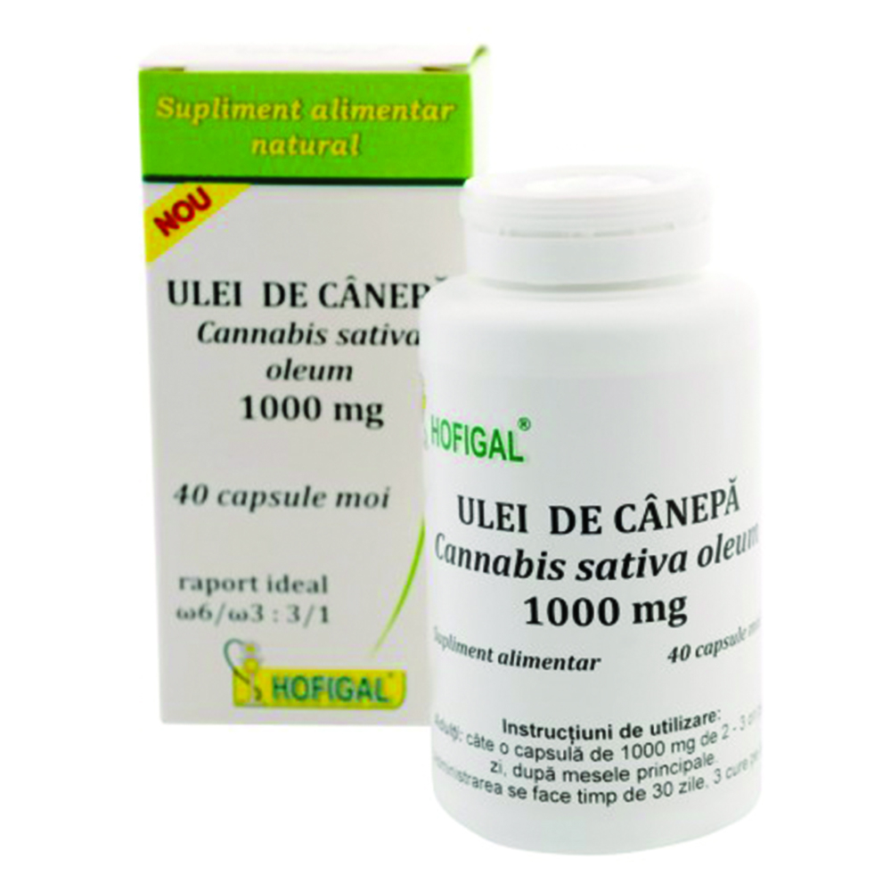 Proprietăți: Uleiul de cânepă, obținut din semințele de cânepă prin presare la rece, este o sursă vegetală de acizi grași Omega-3 și Omega-6 într-un raport optim echilibrat (1:3), net superior uleiului de peste (1:4-5), contribuie la îmbunătățirea și normalizarea funcțiilor oganismului uman. - aliment natural valoros, bogat în fitonutrienți, care susține sănătatea creierului, buna funcționare a sistemului nervos, restabilirea echilibrului emoțional; - ajută la dezvoltarea creierului la copii, stimulează activitatea funcțională a sistemului nervos central; - favorizează îmbunătățirea capacității de concentrare și memorare, contribuie la întreținerea memoriei la toate vârstele; - intervine favorabil în normalizarea valorilor colesterolului și ale trigliceridelor din sânge, ajută la reechilibrarea raportului dintre colesterolul rău (LDL) și colesterolul bun (HDL), normalizează tensiunea arterială; - susține sănătatea inimii și a vaselor de sânge prin reducerea riscului de formare a cheagurilor de sânge la nivelul arterelor coronare, descrește tendința de coagulare a sângelui și ajută la îmbunătățirea circulației sanguine; - optimizează funcțiile sistemului imunitar; - are efect benefic în dieta complexă a persoanelor cu hiperglicemie, ajută la ameliorarea unor tulburări funcționale care depind de dezechilibrele metabolice; - protejează sănătatea organismului în condiții de stres, stări de oboseală și depresie, în activități intelectuale intense și favorizează redobândirea bunei dispoziții și a stării de bine; - ajută la regenerarea țesuturilor și reepitelizarea mucoaselor; - hrănește și regenerează stratul subdermic, obținându-se o piele sănătoasă și catifelată. Ingrediente/capsula moale (1300 mg): -1000 mg ulei din semințe de Cânepă (Cannabis sativa), gelatină, glicerina și apa purificată. Mod de administrare: Adulți: câte o capsulă de 1000 mg de 2 - 3 ori pe zi, după mesele principale. Administrarea se face timp de 30 zile, în 3 cure pe an; Se recomandă asocierea cu produse antioxidante (vitamina C, E, flavonoizi, coenzima Q10). Precauții: Produsul este un supliment alimentar și nu trebuie să înlocuiască o dietă variată și echilibrată și un stil de viață sănătos. Prezentare: 40 capsule