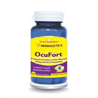 Beneficii: Creste acuitatea vizuala Protejeaza ochiul si vederea Are efect antioxidant Protejeaza retina Creste productia de colagen la nivelul ochilor Stimuleaza circulatia sanguina la nivel ocular Protejarea de stresul oxidativ Hraneste tesuturile conjunctive Intareste sistemului imunitar Combate efectele oboselii oculare OcuFort asigura un aport bogat de Luteina (25 mg/capsula) si Zeaxantina (5 mg/capsula), 4 extracte premium de Afin, Goji, Moringa si Rozmarin si 3 vita-minerale: vitamina E, Cupru si vitamina B2. La acestea se adauga si uleiul de cocos cu MCT (Trigliceride cu catena medie), care asigura o absorbtie ridicata. Formula OcuFort este dedicata pentru a proteja ochiul si vederea, retina si acuitatea vizuala. OcuFort cu Luteina (25 mg/capsula) si Zeaxantina (5 mg/capsula), extrase din extractul premium de flori de Craita are rolul de a filtra 90% din lumina albastra si radiatiile UV, protejand retina de degradare prin puterea antioxidanta. Asocierea de Luteina cu Zeaxantina este benefica pentru claritatea vederii, protectia acesteia de daunele cauzate de expunerea la lumina albastra a ecranelor si pentru a intarzia degradarea avansata a vederii. Extractul de Afin standardizat cu 25% Antocianidine asigura protectia retinei de expunerea la lumina UV si mentine productia de colagen necesar pentru a mentine structura retinei. Extractul de Goji standardizat cu 50% Polizaharide protejeaza vederea de radicalii liberi si de stresul oxidativ. Extractul de Moringa (Moringa oleifera) standardizat cu 30% Saponine protejeaza ochiul de efectele radicalilor liberi. Extractul de Rozmarin (Rosmarinus officinalis) standardizat cu 10% Acid Carnosic previne degenerarea vederii, iar acidul Carsonic protejeaza fotoreceptorii prezenti pe retina. Vitamina E protejeaza ochiul de degradare si de efectele razelor UV. Cupru creste acuitatea vizuala si stimuleaza productia de enzime cu efect antioxidant. Vitamina B2 este un adjuvant pentru combaterea efectelor cataractei si pentru claritatea vederii. Produs notificat de CRSP CLUJ Seria AC, nr. 4517/ 13.05.2024 Compozitie: Extract din flori de Craite ce garanteaza 25 mg Luteina si 5 mg Zeaxantina: 125 mg Trigliceride cu catena medie (MCT 70%) din ulei de Cocos: 100 mg Extract de Afin standardizat cu 25% Antocianidine: 75 mg Extract de Goji standardizat cu 50% Polizaharide: 75 mg Extract de Moringa standardizat cu 30% Saponine: 53 mg Vitamina E din Floarea Soarelui: 35 mg Extract de Rozmarin standardizat cu 10% Acid Carnosic: 25 mg Cupru Bisglicinat, furnizand 27% Cupru: 10 mg Vitamina B2 / Riboflavin: 2 mg Capsula vegetala Fiecare capsula asigura: 25 mg Luteina, 5 mg Zeaxantina, 4 extracte si 3 vita-minerale Mod de administrare: 1 capsula/zi Mod de depozitare: a se pastra la loc uscat si racoros. Produs in Romania
